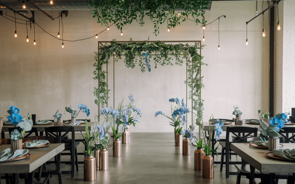 The table centers feature a mix of tall glass vases and fresh greenery, creating a refined yet natural atmosphere. The soft blue flowers complement the surrounding decor, and the varying heights of the centerpieces add visual interest and sophistication to the table setting.