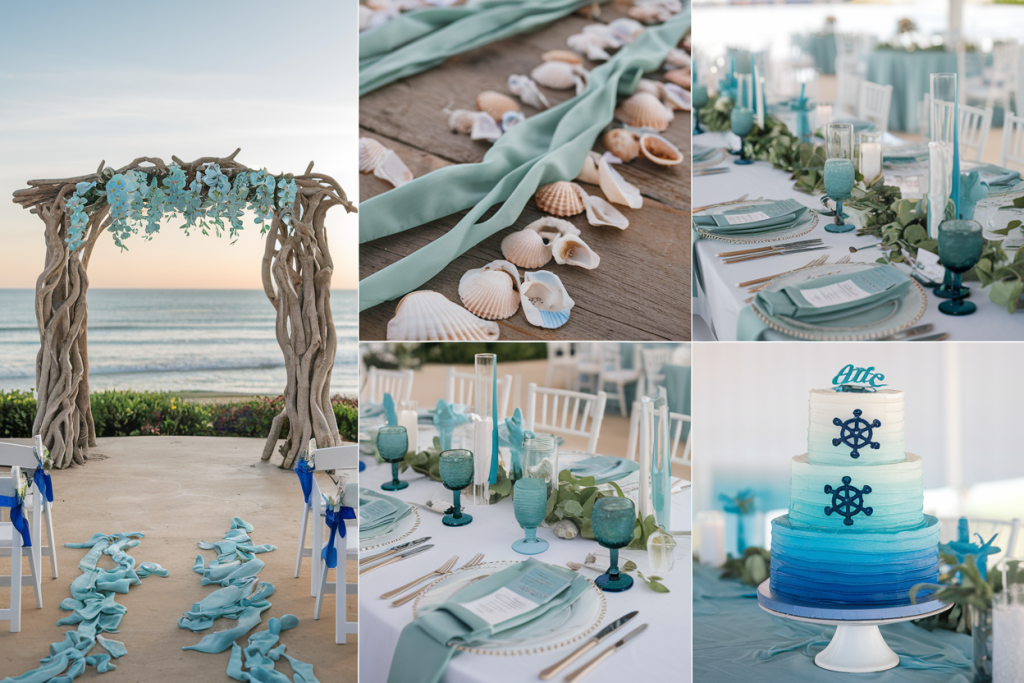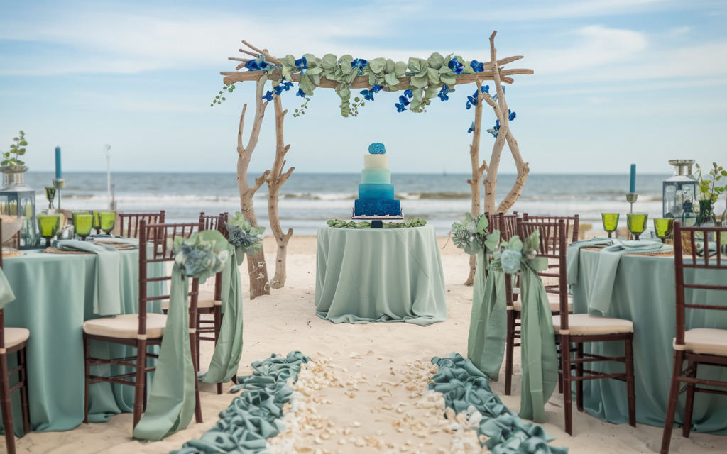 The centerpiece of the decor is the stunning driftwood arch adorned with cascading blue orchids and lush greenery, creating a natural and intimate backdrop for the ceremony. In front, a beautifully layered ombre wedding cake sits on a mint-colored table, surrounded by soft blooms and greenery that reflect the colors of the ocean. The seating area is elegantly arranged with bamboo chairs draped in sage green fabric, while a path of seashells and teal fabric petals leads the way to the altar, adding a personal, romantic touch. The delicate blue glassware and soft, flowing tablecloths complete the idyllic coastal vibe, while the gentle sea breeze adds a sense of tranquility to the entire scene.