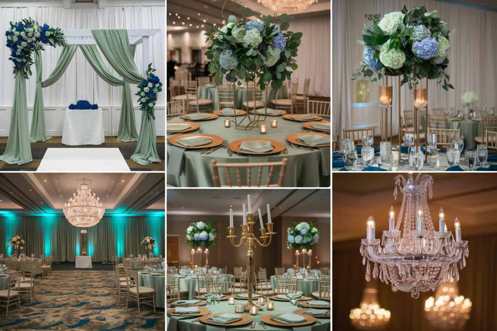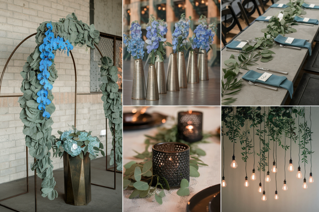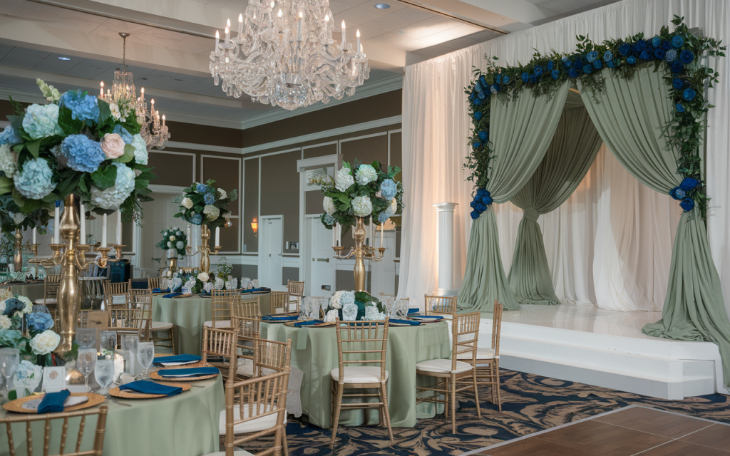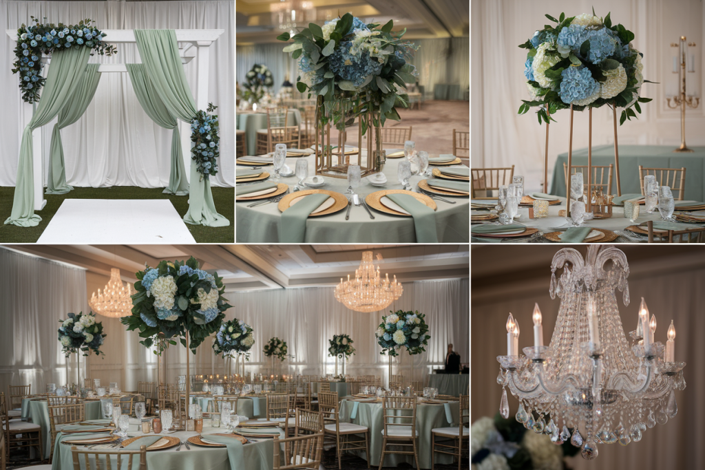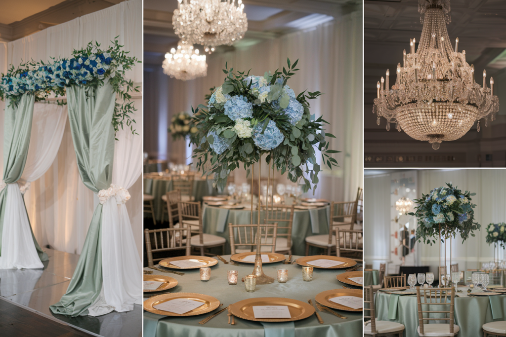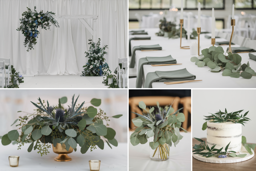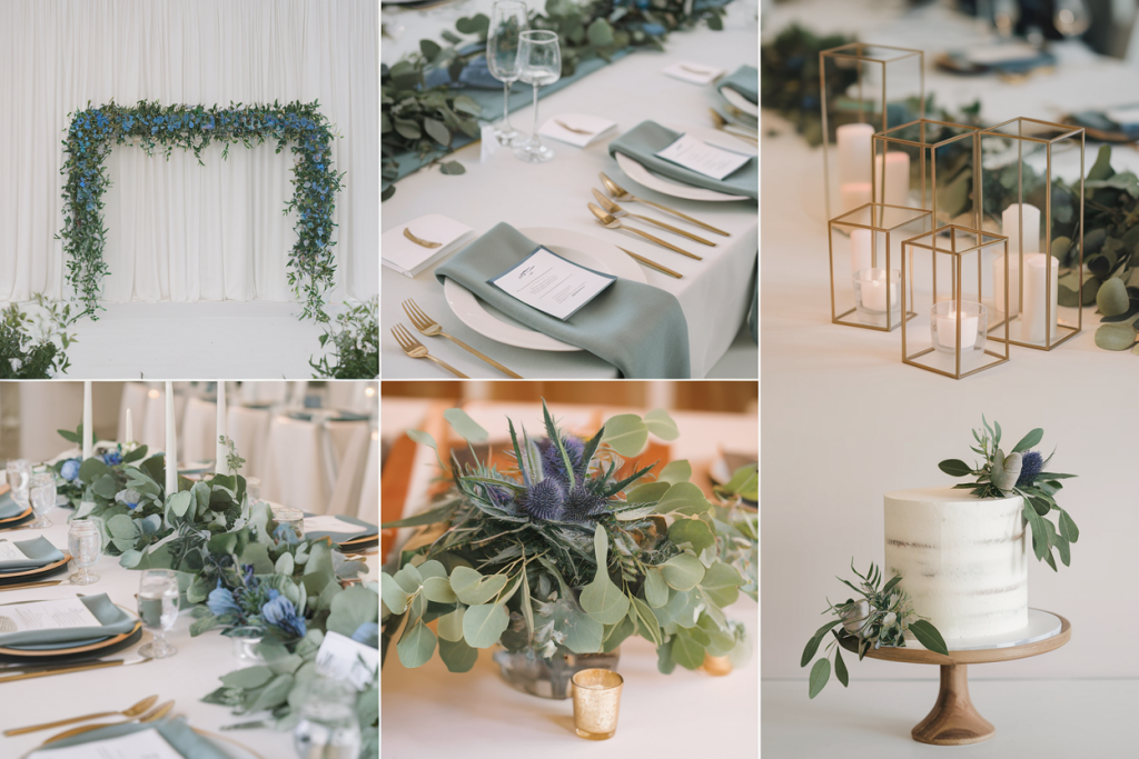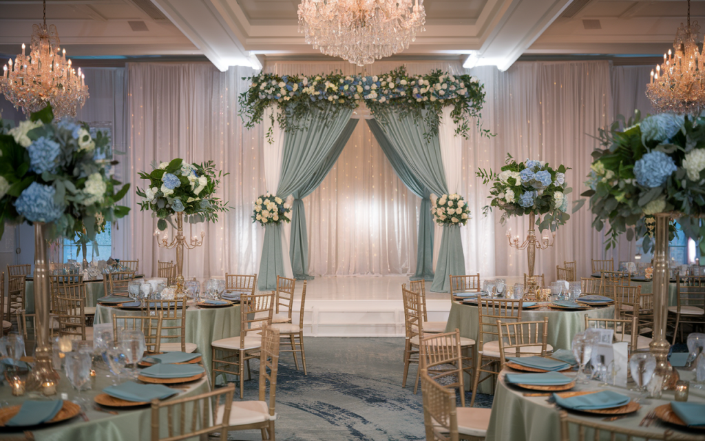 The floral centerpieces, arranged in muted vases, combine blue hydrangeas, white roses, and eucalyptus sprigs. The mix of cool and neutral tones adds depth and elegance to the tablescape. These arrangements anchor the design with their fullness and variety, ensuring every table is visually appealing.