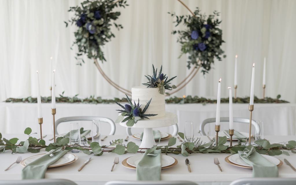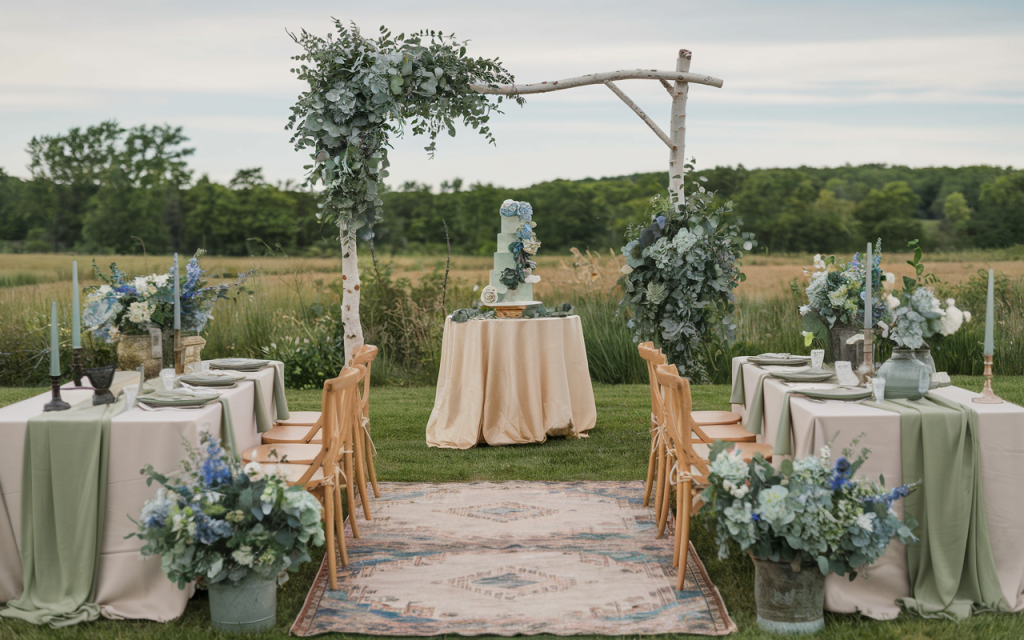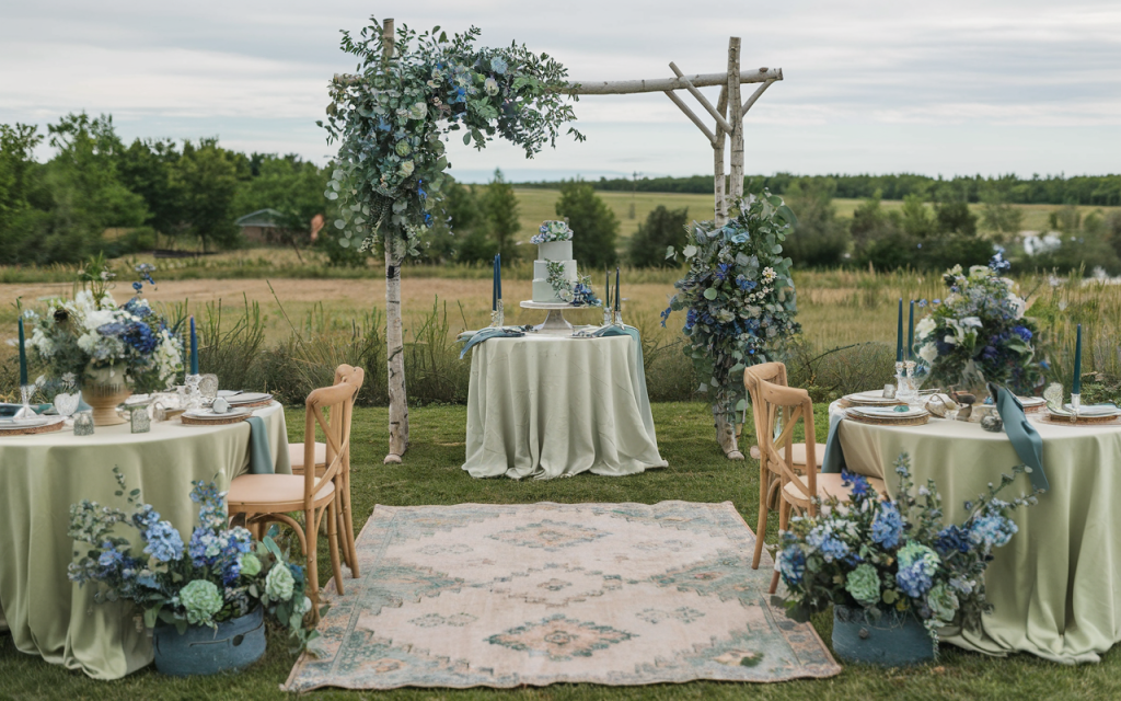 Embrace the tranquility of the countryside with this stunning wedding setup, where sage green and soft blue hues create a harmonious blend of elegance and natural beauty. A handcrafted birchwood arch draped in eucalyptus and delicate blue blooms serves as the centerpiece, perfectly framing the tiered cake with cascading floral details.
