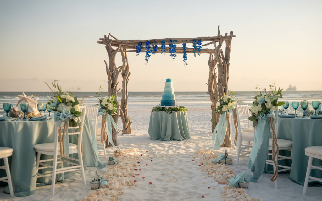 This stunning coastal-inspired wedding setup captures the beauty of nature with a delicate balance of elegance and simplicity. Soft, ocean hues blend seamlessly with the serene beach atmosphere, creating an unforgettable experience for any couple. The perfect combination of rustic charm and sophisticated decor sets the tone for a relaxed yet luxurious celebration.