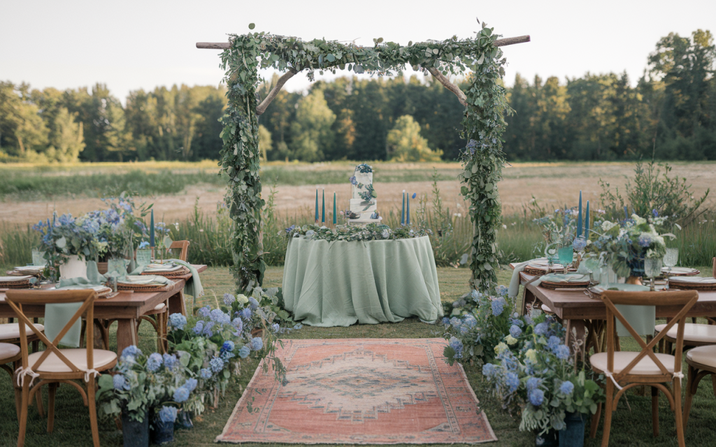 The tablescape features sage-green linens paired with elegant blue accents, from taper candles to floral centerpieces bursting with hydrangeas and eucalyptus. Handpicked vintage-style vases and intricate tableware add a layer of sophistication, while the muted pastel rug in front of the altar softens the ambiance, tying the setup together harmoniously.
