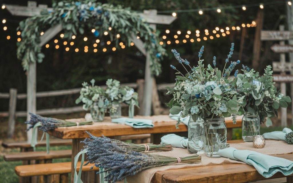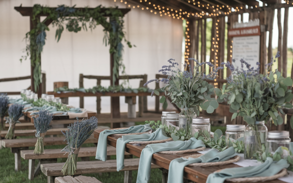 A serene yet striking combination of rustic wooden elements and natural florals, this setup exudes countryside charm with a touch of sophistication. Long wooden tables and benches are adorned with sage napkins, burlap runners, and handcrafted eucalyptus garlands that extend the length of the tables. Bundles of fresh lavender, neatly tied with twine, add pops of soft purple and create a fragrant, inviting atmosphere.