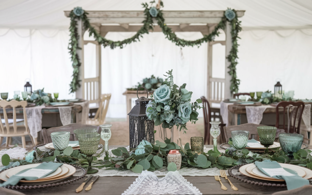 The vintage green glassware brings a pop of color and texture to the table settings. These intricately designed goblets and tumblers offer a mix of patterns and sizes, adding visual interest while reinforcing the rustic, vintage aesthetic. Their muted green hue complements the greenery and floral arrangements, enhancing the natural theme.