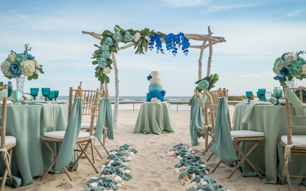 A serene coastal wedding setup that reflects the beauty of the sea, with delicate blues, gentle greens, and a soft sandy backdrop, creating an intimate yet elegant atmosphere. This stunning beachside scene evokes a sense of calm, making it the perfect setting for a relaxed yet sophisticated celebration.