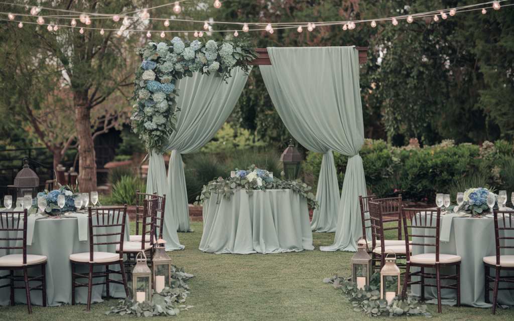 A serene blend of sage green and soft blue tones sets the stage for this breathtaking countryside wedding decor. The rustic charm of birch wood arches, adorned with cascading greenery and delicate blooms, creates an intimate, nature-inspired focal point.