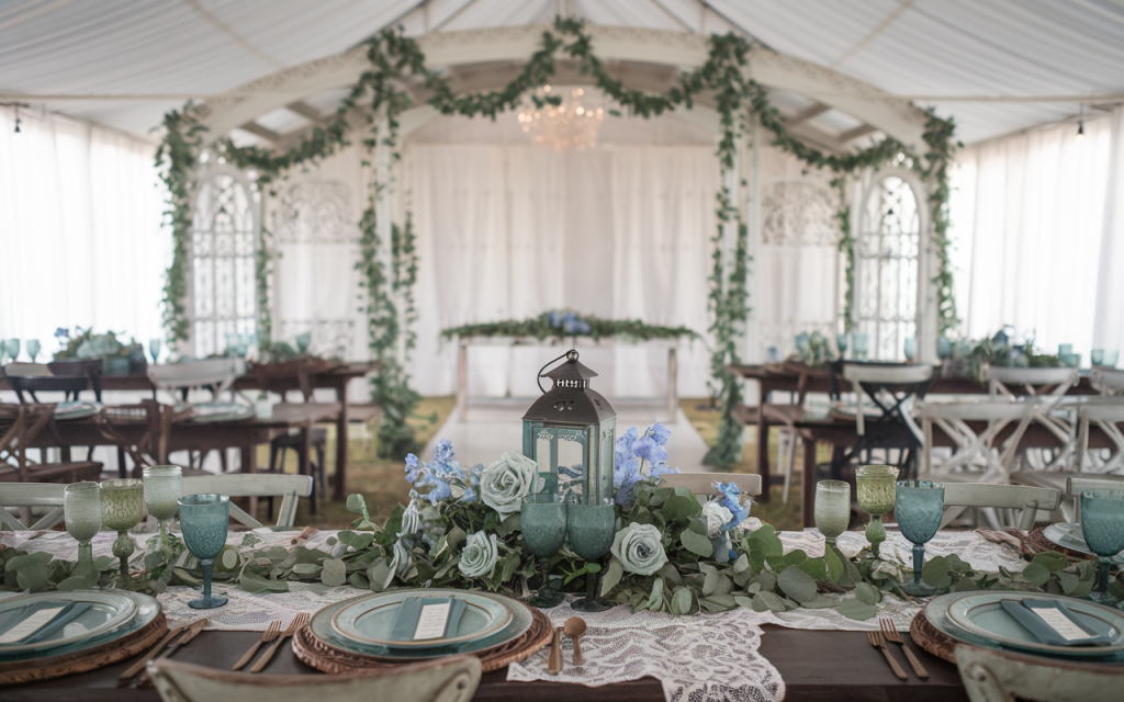 A dreamy fusion of rustic charm and vintage elegance, this decor transports guests to a whimsical world filled with soft greenery and delicate lace accents. The centerpiece of the design is a stunning garland of eucalyptus and blue florals that runs the length of the tables, perfectly complementing the lace runners and distressed wooden surfaces. The space is enriched with soft, flowing greenery draped along arched structures and ceiling beams, adding a natural yet curated look. Delicate vintage lanterns and pastel blue goblets enhance the tablescape, offering both functionality and timeless style.
