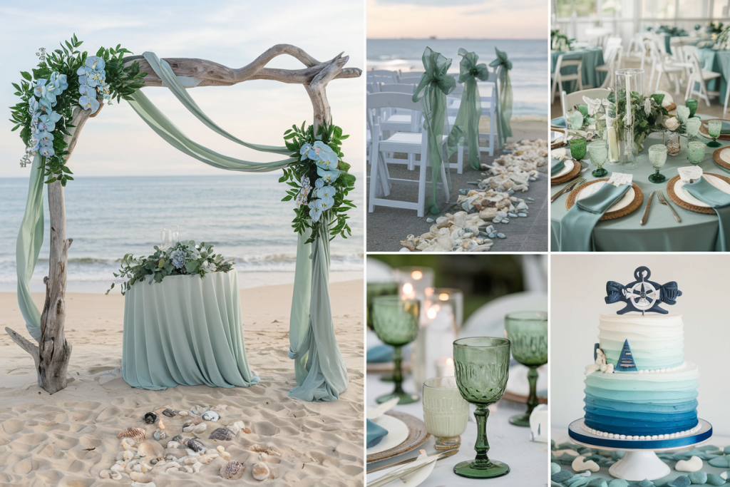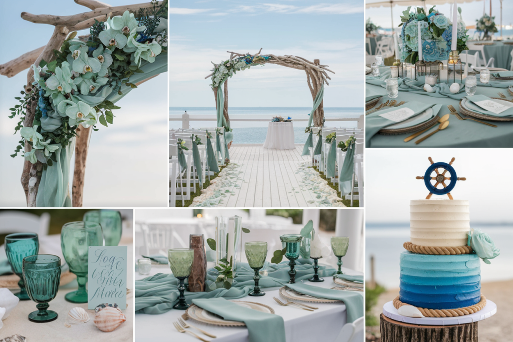 The green glassware placed on the table ties the decor together, offering a soft contrast to the blues and whites. Paired with clear votive candles and delicate plants, these elements create an elegant yet organic look, bringing the entire coastal theme to life with charm and style.