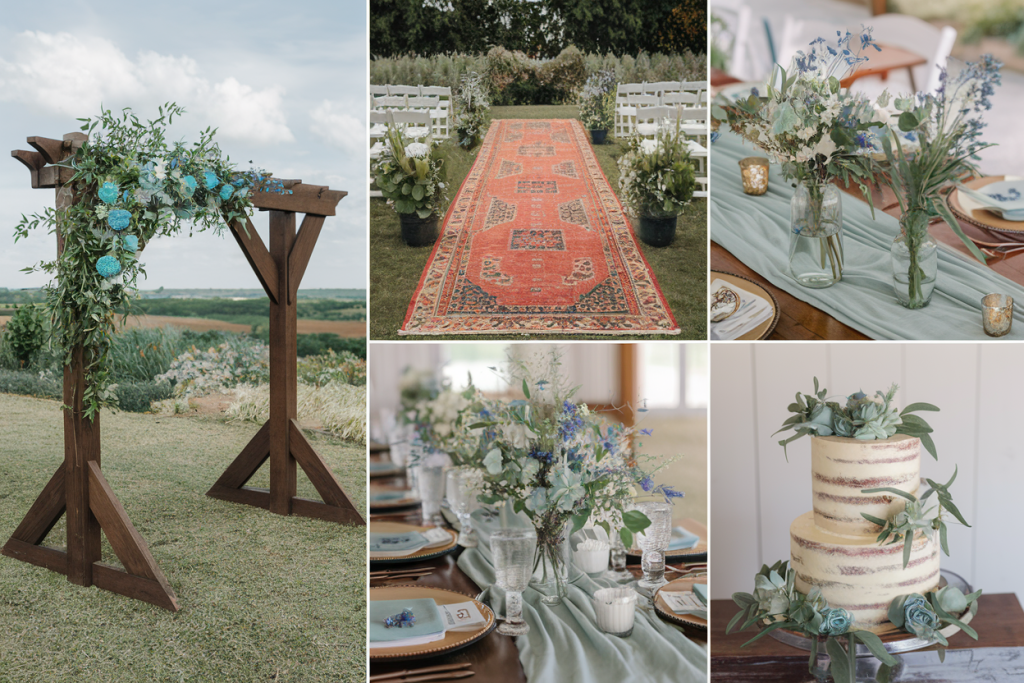 This enchanting wedding decor exudes rustic elegance, combining earthy tones with romantic floral accents. A lush greenery-covered arch frames a minimalist tiered cake adorned with delicate blue blooms, creating a stunning centerpiece against the serene countryside backdrop.