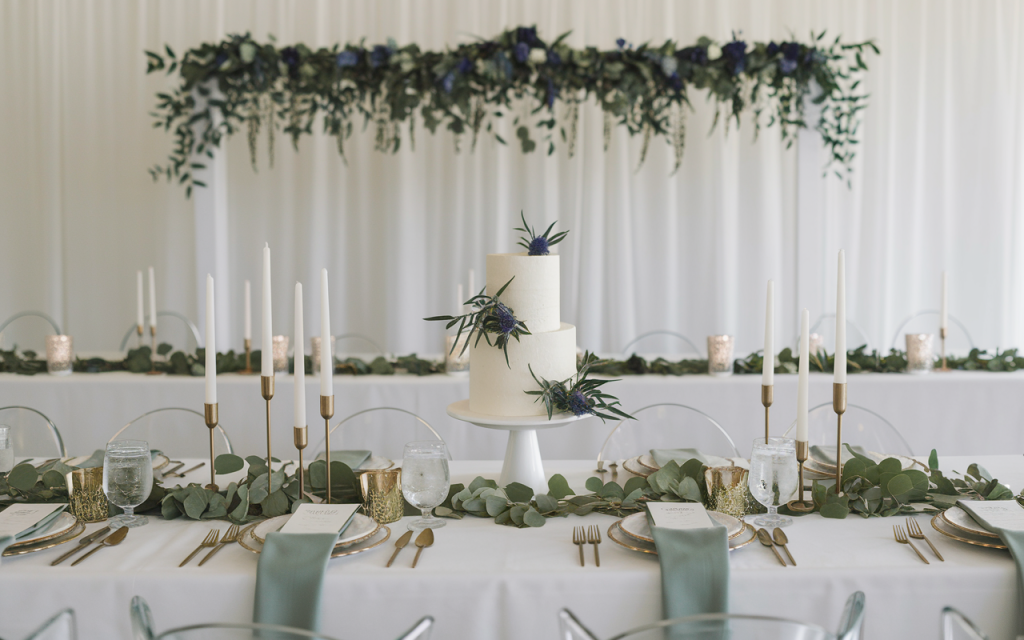 The long tables are adorned with soft sage-green runners that cascade gently over the edges, creating a seamless and elegant look. Interspersed along the runners are eucalyptus garlands paired with simple glass vases holding additional sprigs of greenery and hydrangeas. These understated centerpieces complement the tablescape’s natural tones while providing an open and airy feel for seated guests.