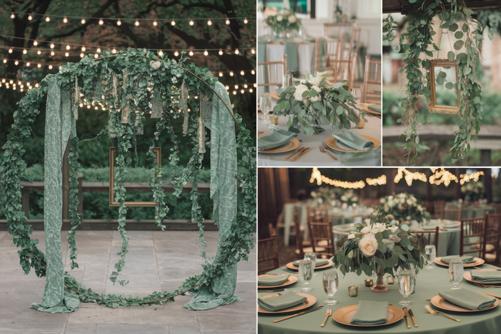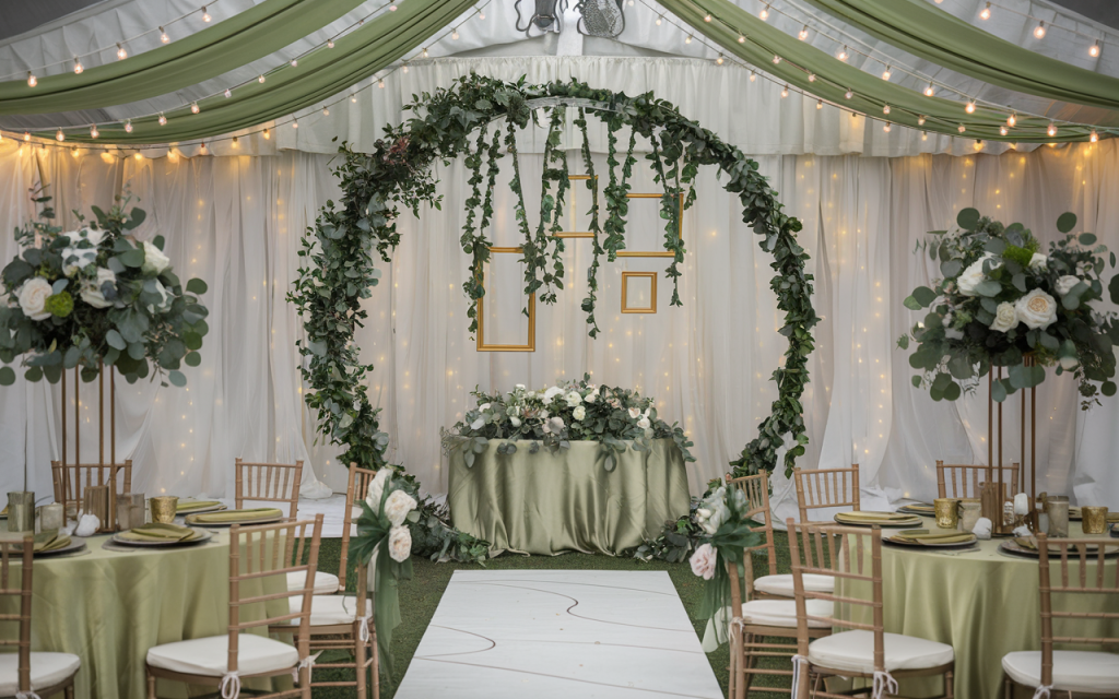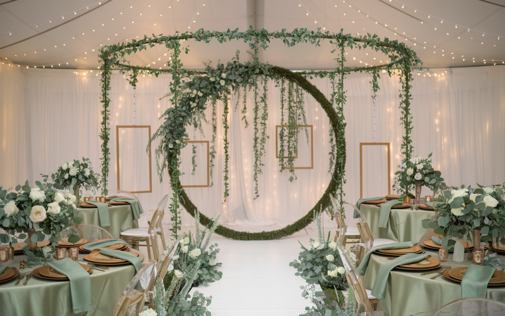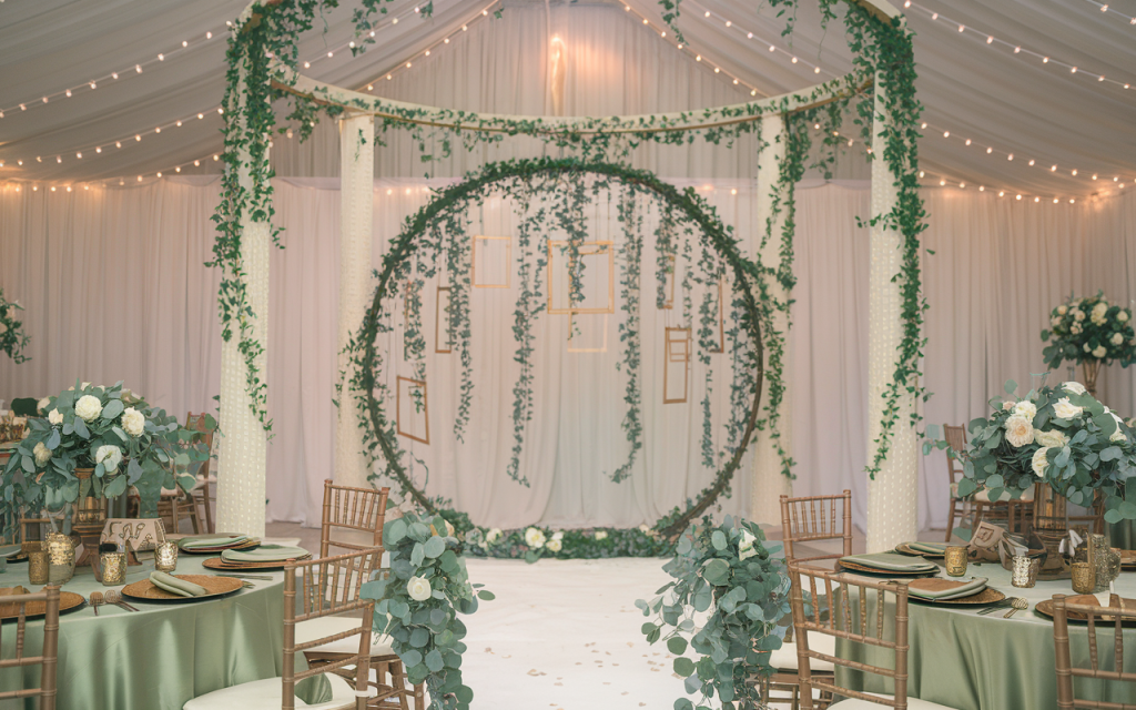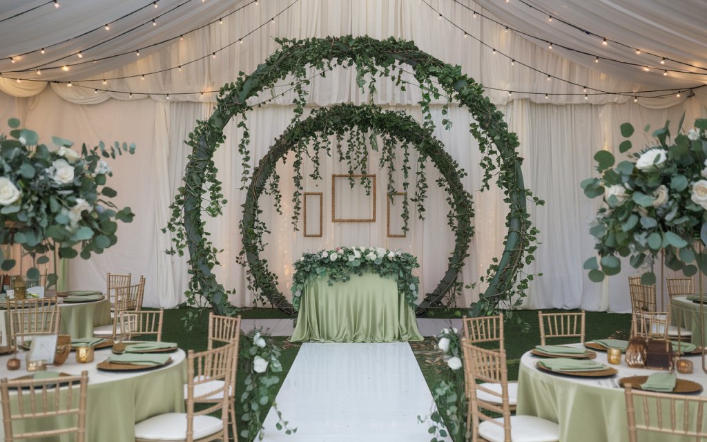 The ceremony area is highlighted by an enchanting circular arch, decorated with lush greenery and flowing sage green fabric. The natural elements, including eucalyptus, create a rustic charm, while the soft fabric adds a whimsical touch. Small golden frames and cascading floral details enhance the romantic aesthetic, creating an intimate and elegant space for the ceremony.