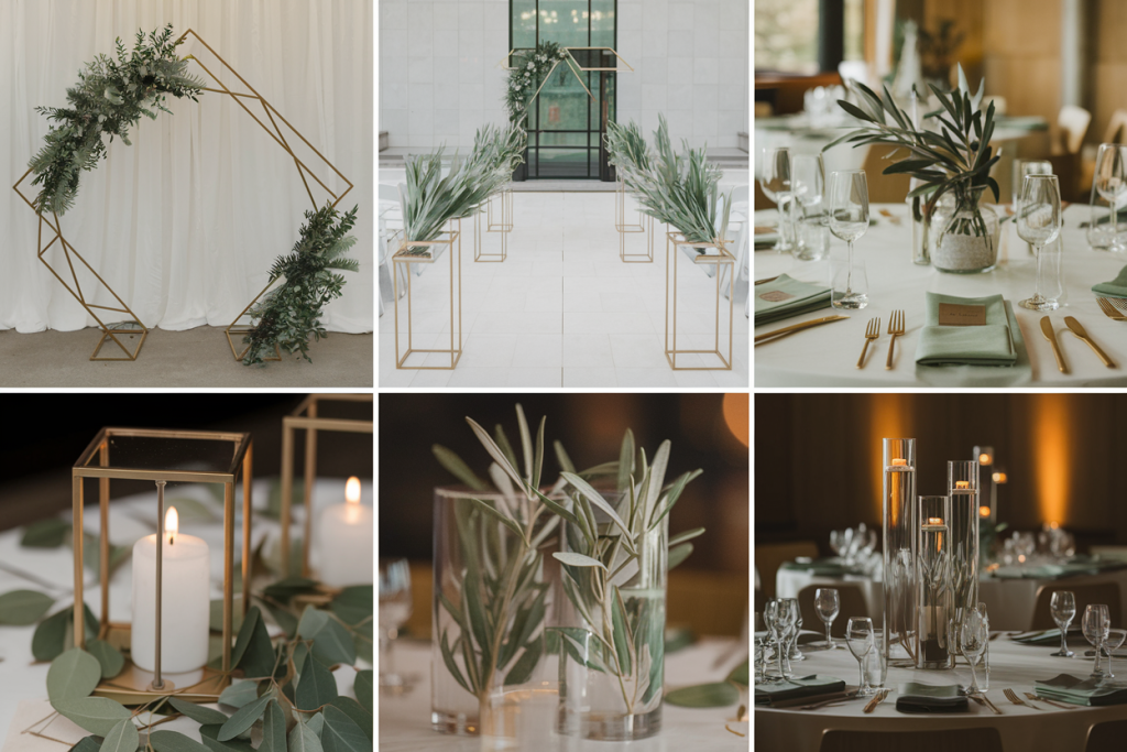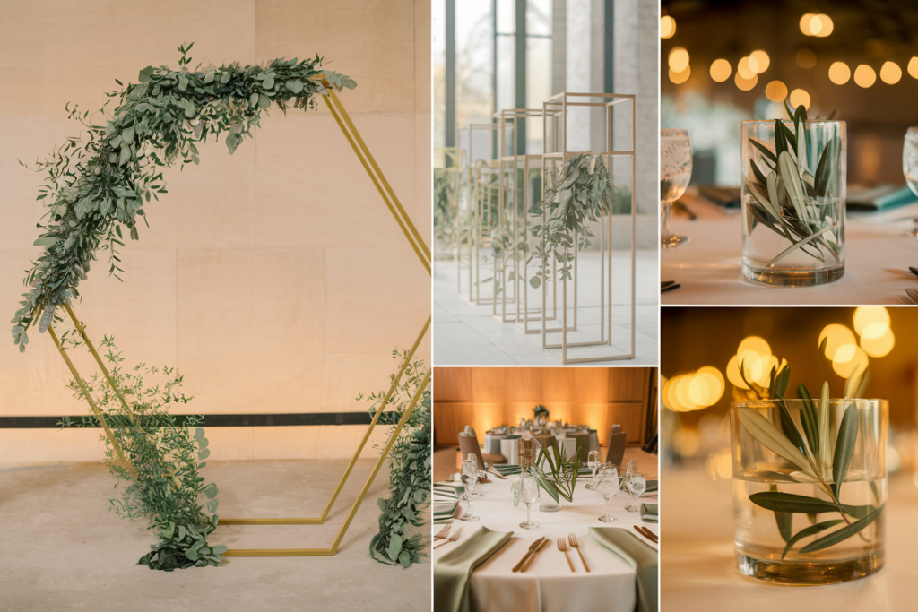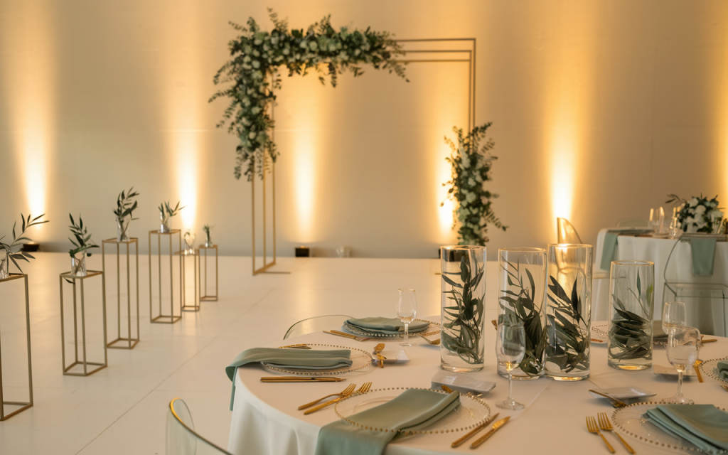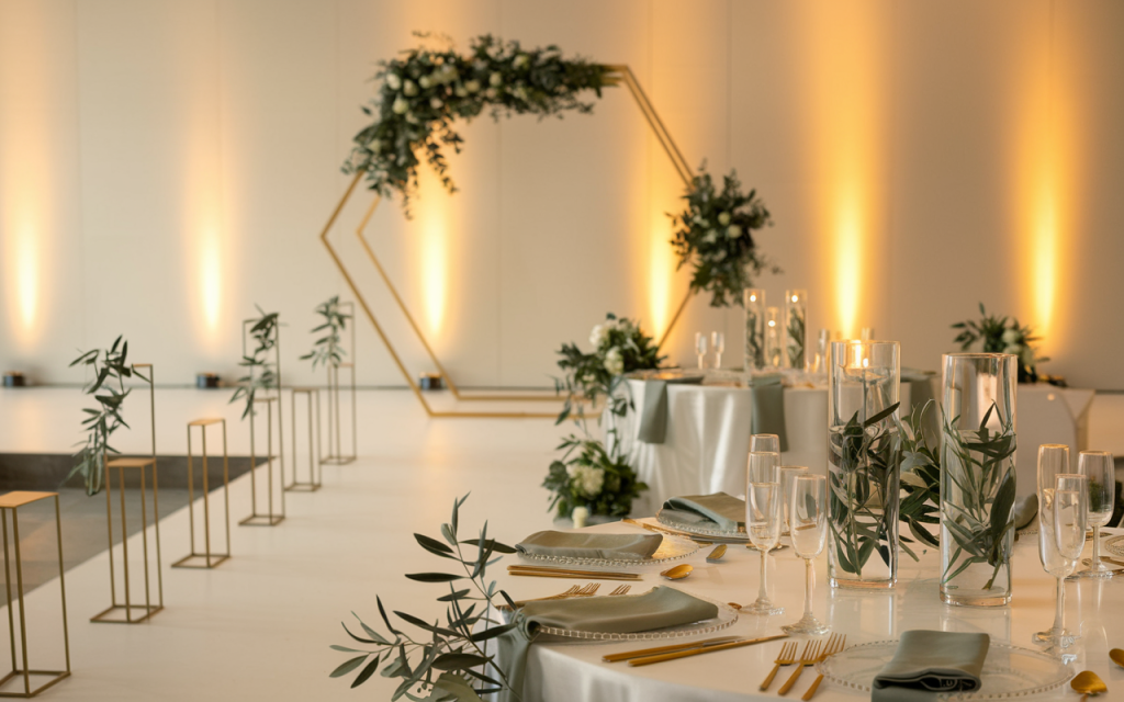 The focal point is a striking gold hexagonal arch adorned with asymmetrical greenery arrangements, providing a bold and modern backdrop for the ceremony. Along the aisle, gold geometric stands hold simple olive branch arrangements, adding a natural yet minimalist touch. Tables are dressed in crisp white linens, with sage napkins and gold flatware offering subtle pops of color and elegance. Clear cylindrical vases with submerged olive branches serve as understated centerpieces, further enhancing the modern aesthetic. Warm uplighting softens the space, creating an intimate and inviting atmosphere.