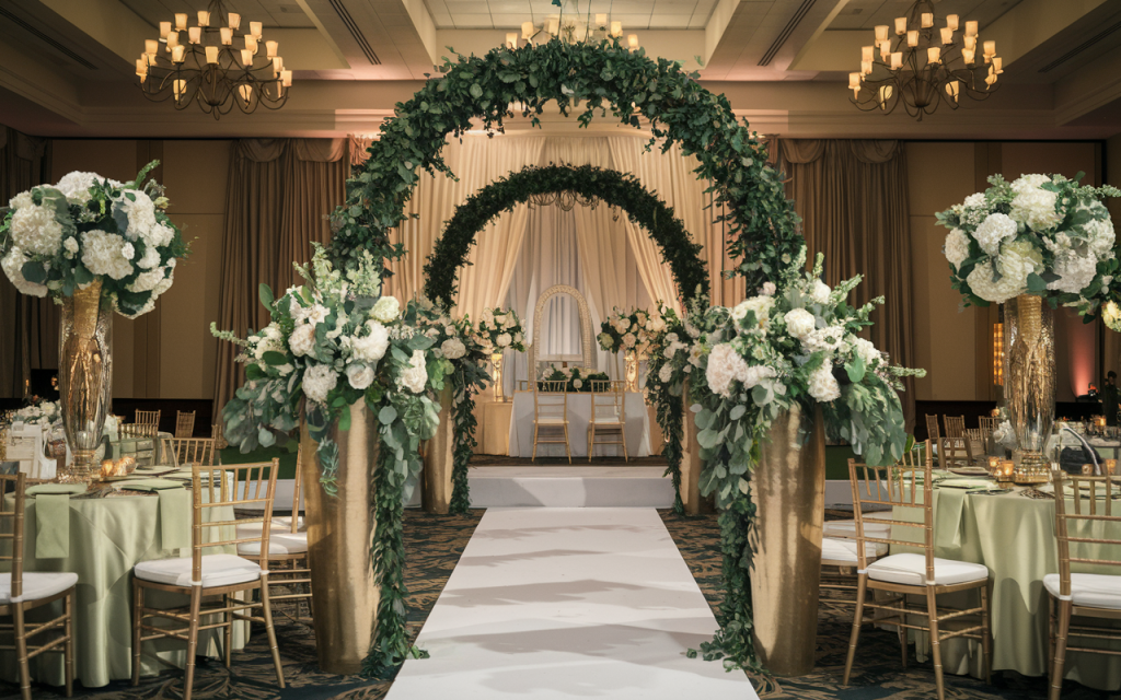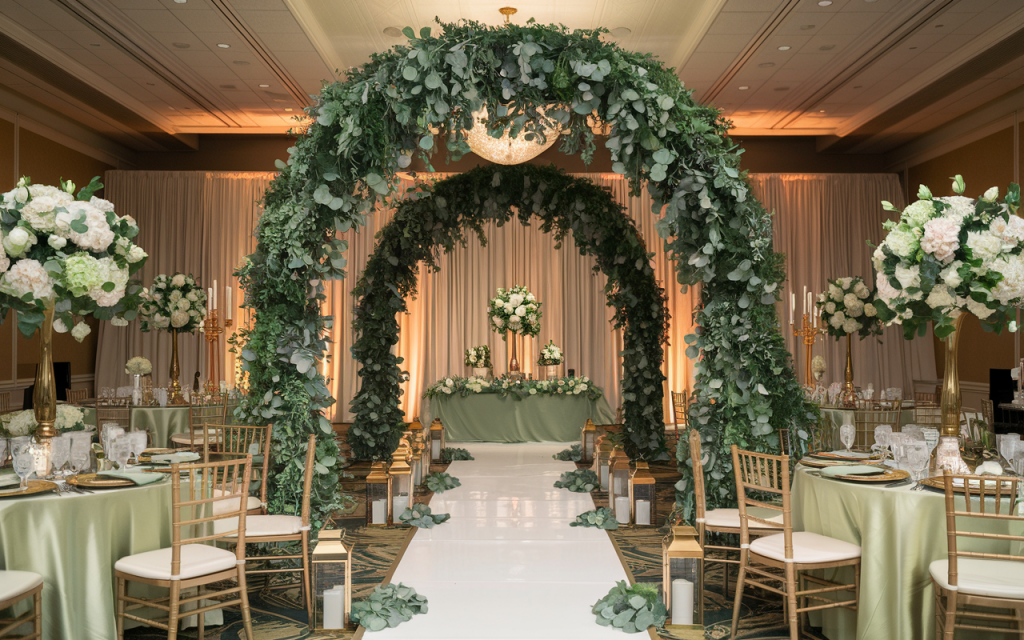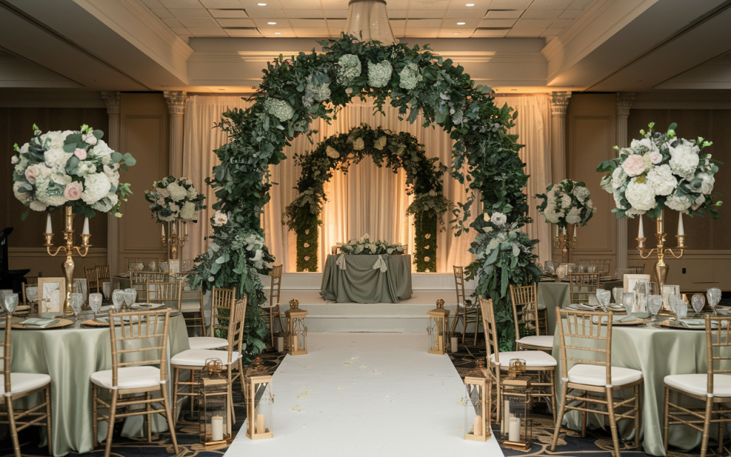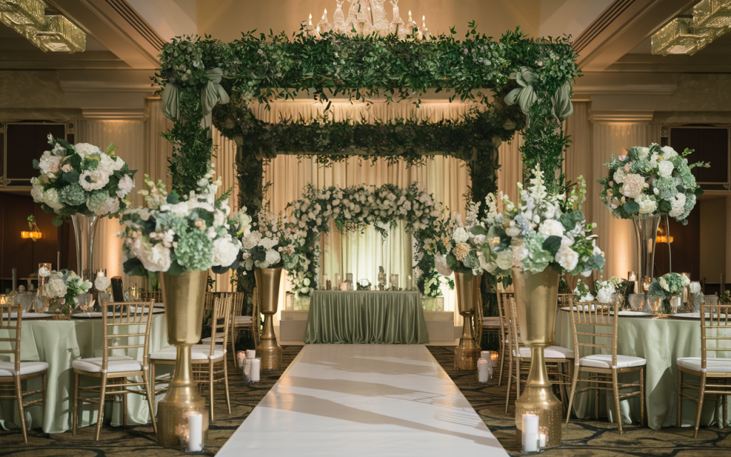 The grand entrance is framed by a lush greenery arch, artfully designed with cascading vines and white florals, creating a breathtaking pathway to the altar. The floral arrangements are meticulously placed in towering golden vases, featuring a blend of soft white and green blooms. A satin sage green tablecloth complements the soft, natural hues, and candlelight flickers from golden votives, filling the space with a soft glow. This carefully orchestrated design creates an inviting, romantic atmosphere that envelops guests in warmth and sophistication.