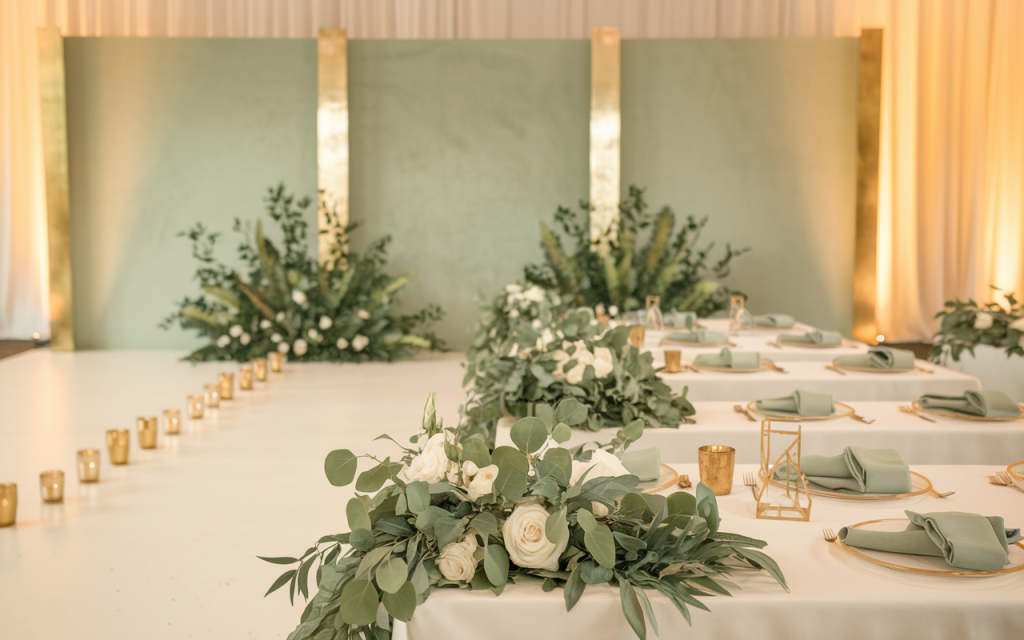 Reception tables are adorned with soft sage green linens, with cascading greenery garlands running down the length of each table. The garlands, composed of eucalyptus and ivy, add a touch of organic beauty to the clean, minimalist table design. These garlands create a continuous flow, connecting the decor across the event space.