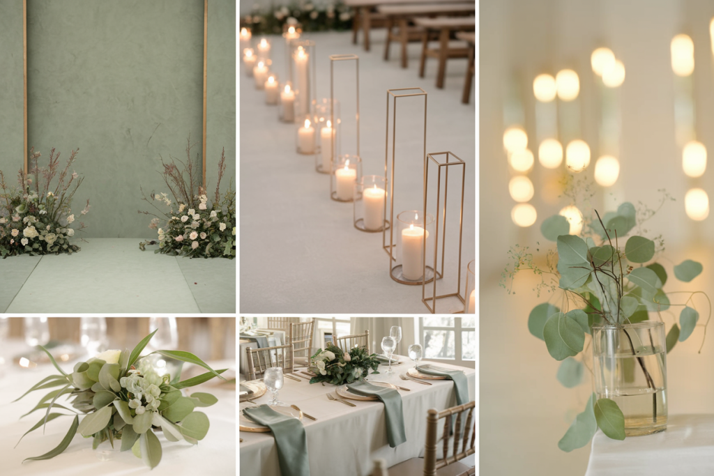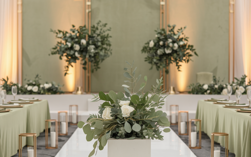 This wedding design exemplifies contemporary elegance with its minimalist approach, where sage green accents and subtle gold elements blend seamlessly to create a serene yet luxurious atmosphere. The clean lines and modern decor provide a timeless and sophisticated setting.