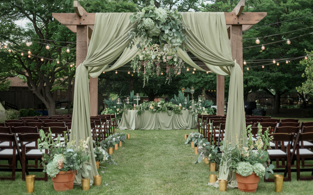 The focal point of this setup is the wooden pergola, adorned with sage green drapery that softly billows in the breeze, creating a romantic frame for the ceremony. Cascading greenery, white roses, and blush accents hang delicately above the altar, while terracotta pots brimming with lush eucalyptus and floral arrangements line the aisle, blending seamlessly into the natural surroundings. Wooden cross-back chairs add a rustic yet polished touch, while strings of twinkling bistro lights overhead add warmth and intimacy as evening falls.