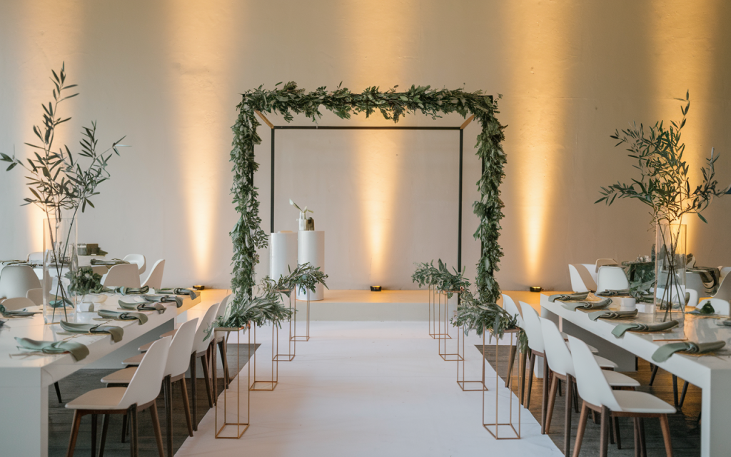 The aisle is flanked by gold pedestal stands, each showcasing simple yet stunning greenery arrangements. The use of olive branches and eucalyptus in clear vases emphasizes a fresh and natural look. These pedestals enhance the overall flow of the space, guiding guests’ eyes toward the ceremony focal point while maintaining the minimalist theme.