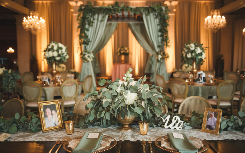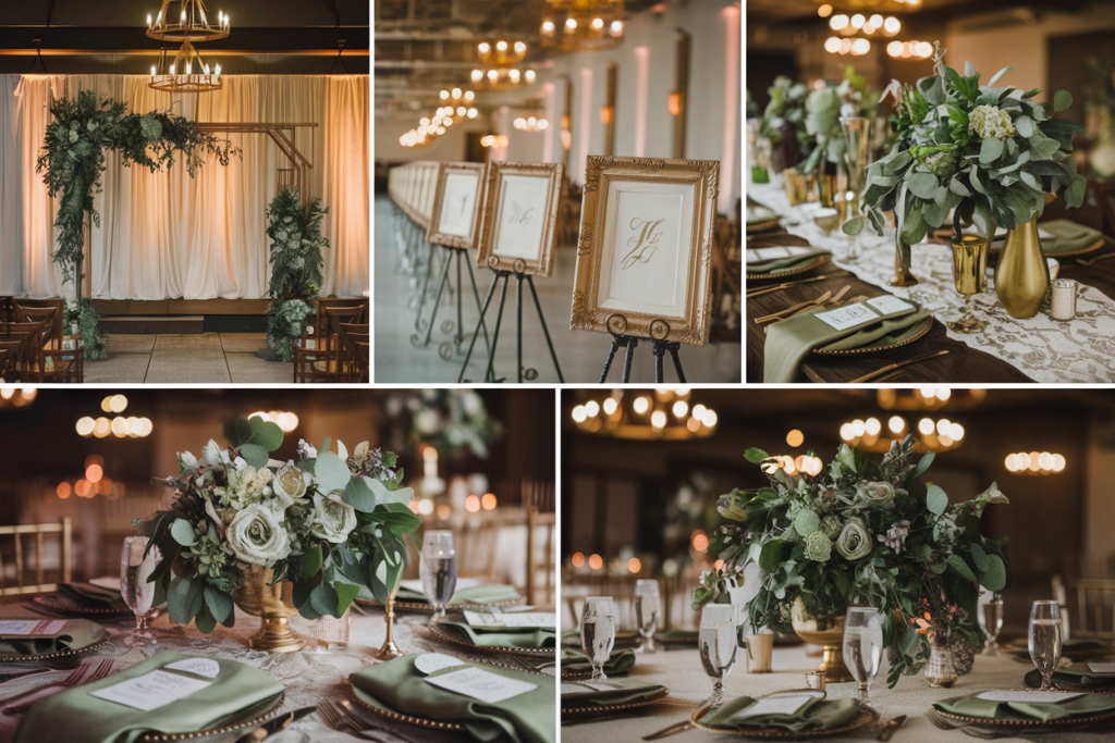 This sophisticated wedding decor radiates timeless beauty, with a perfect blend of lush greenery and soft gold accents. The soothing sage green drapery creates an inviting, serene backdrop, while the carefully arranged centerpieces bring an air of romance and warmth to the space.