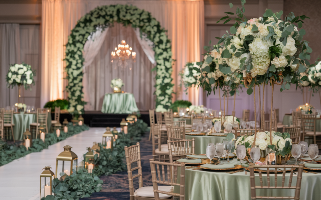The focal point of the room is a grand floral arch, intricately adorned with lush greenery and white blossoms, perfectly framing a glittering chandelier that casts a warm glow over the space. The aisle, lined with eucalyptus and gold lanterns filled with flickering candles, leads to a raised platform draped in sage fabric for an enchanting centerpiece. The tables are elegantly dressed in sage-green linens, with golden chargers and flatware complementing the theme. Towering floral arrangements of hydrangeas and roses with cascading greenery stand on gold candelabra bases, adding height and drama to the overall design.