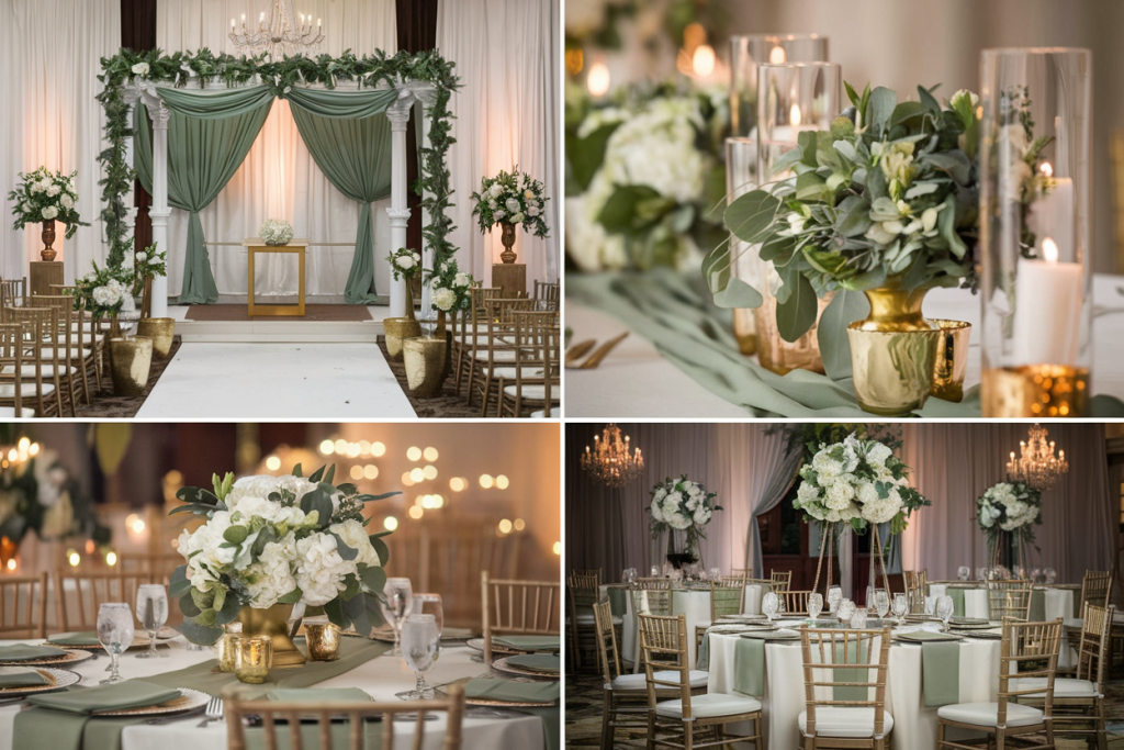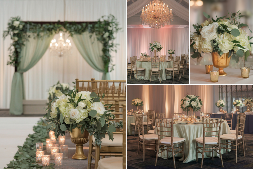 This setup is ideal for couples seeking a refined, timeless atmosphere for their wedding. Perfect for venues with spacious ballrooms or grand halls, this decor is sure to captivate guests with its elegance. The subtle sage green tones also make it ideal for a spring or summer wedding.