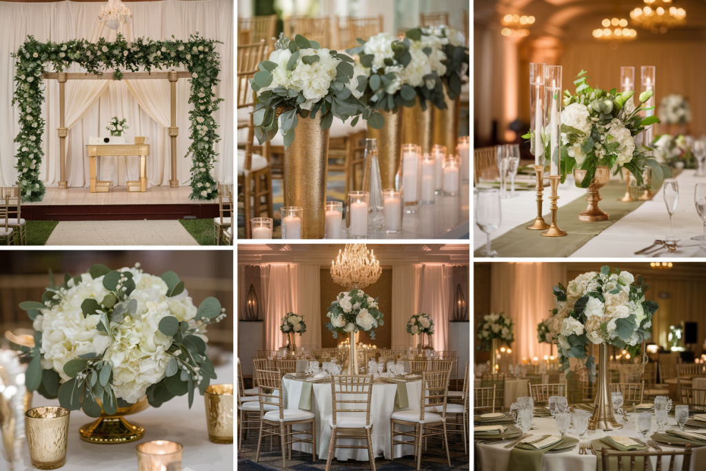 The reception tables feature stunning floral centerpieces in gold pedestal vases. These arrangements, composed of white roses, hydrangeas, and eucalyptus, bring height and texture to each table. The soft greens and whites create a calming yet elegant look, while the gold vases provide a subtle metallic sheen, enhancing the overall theme of the event.
