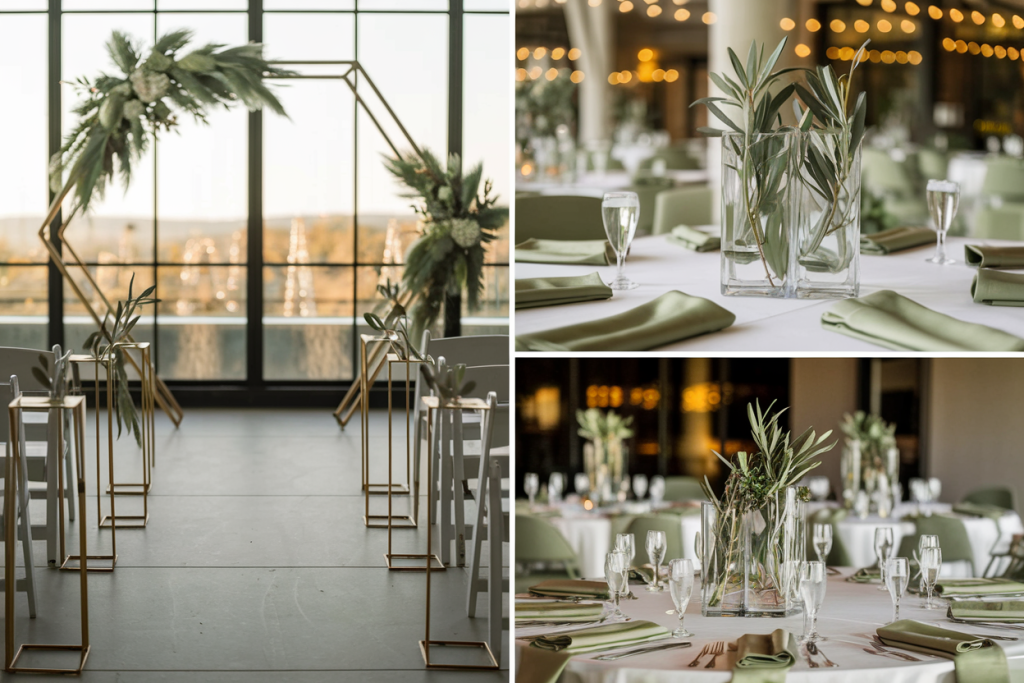 Each table is adorned with tall, clear glass vases holding simple olive branch arrangements. These centerpieces create a fresh and natural look, with the transparency of the vases adding a sense of lightness to the design. The olive branches tie into the sage green palette, reinforcing the cohesive theme.