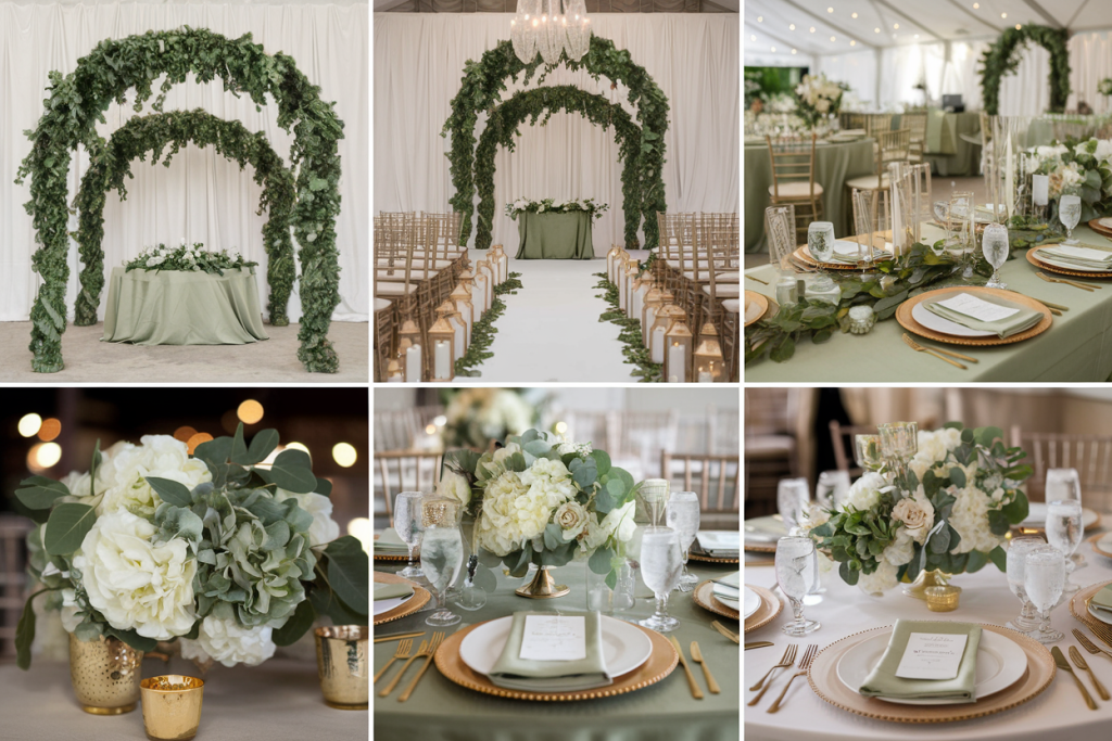 The sage green tablecloths provide a calming and serene base for the tablescape, tying together the natural and metallic elements of the decor. The soft tone of the linens complements the greenery in the centerpieces and aisle decor, creating a harmonious color palette that feels fresh and elegant.
