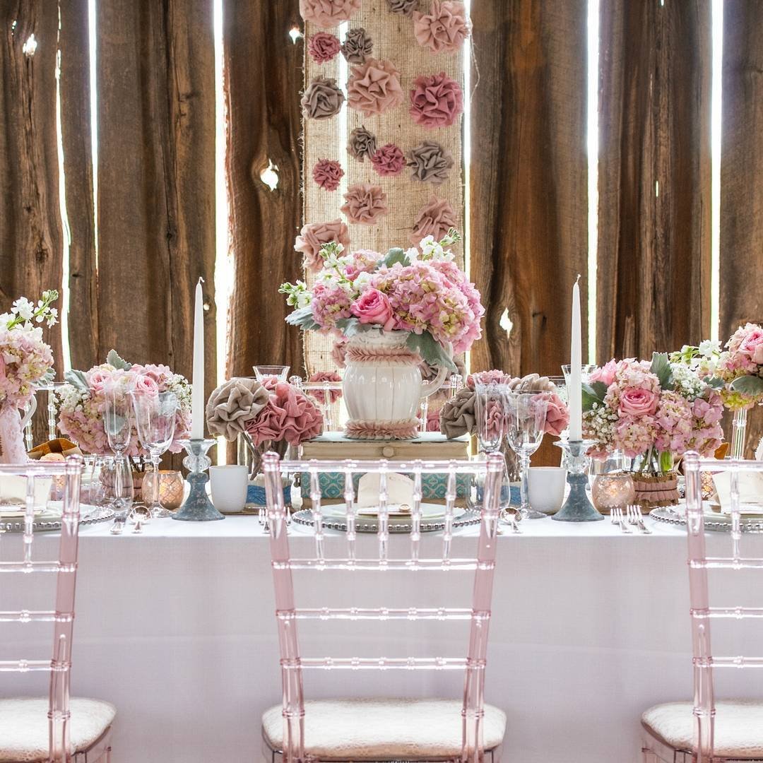 Soft pink hydrangeas spill from a classic ceramic vase, surrounded by layered linens and gauzy fabric blooms pinned to a rustic backdrop. Clear chairs keep the palette light, letting the roses and candlelight take center stage.