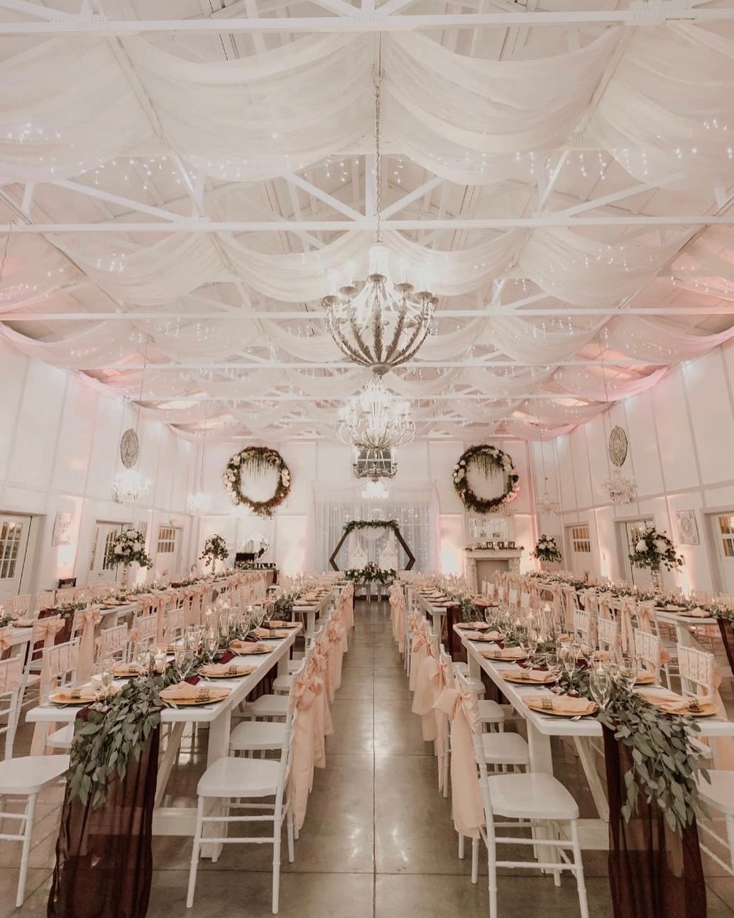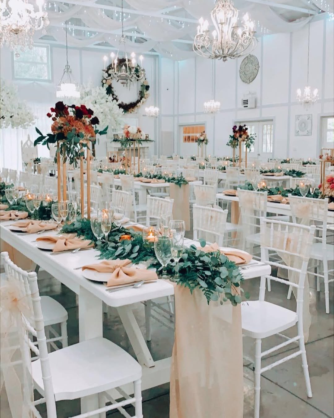 Long banquet tables stretch across the room, each crowned with a fresh green garland and soft candlelight. Peach napkins fold neatly at every setting, adding just enough warmth to break up the sea of white chairs and tables.