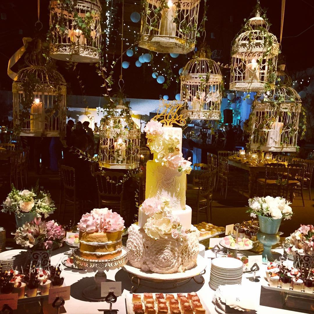 Hanging birdcages filled with candles float above a towering floral cake, casting golden shadows across the room. Ivy trails from the cages, softening the metal and adding that dreamy, old-world touch.