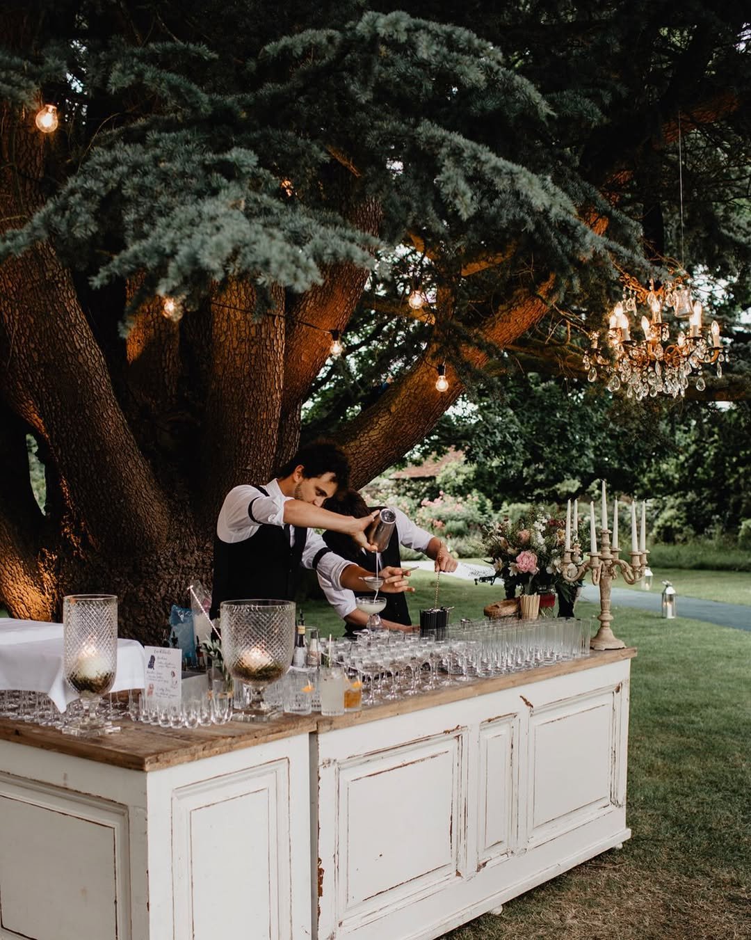 It is the kind of setting that turns cocktail hour into a memory. The mix of elegance and ease captures shabby chic at its best, refined glassware paired with relaxed garden charm. Add vintage candelabras and soft florals, and suddenly the evening feels like a scene from a romantic film.