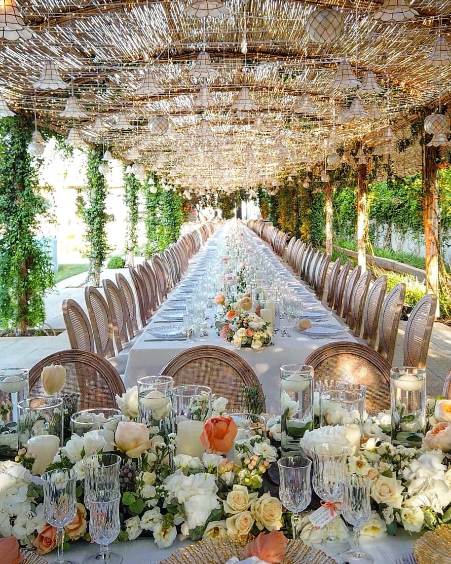 A long table stretches beneath a canopy of woven reeds and twinkling lights. Cane-back chairs line either side, while low arrangements of cream and peach roses run the length of crisp white linens.