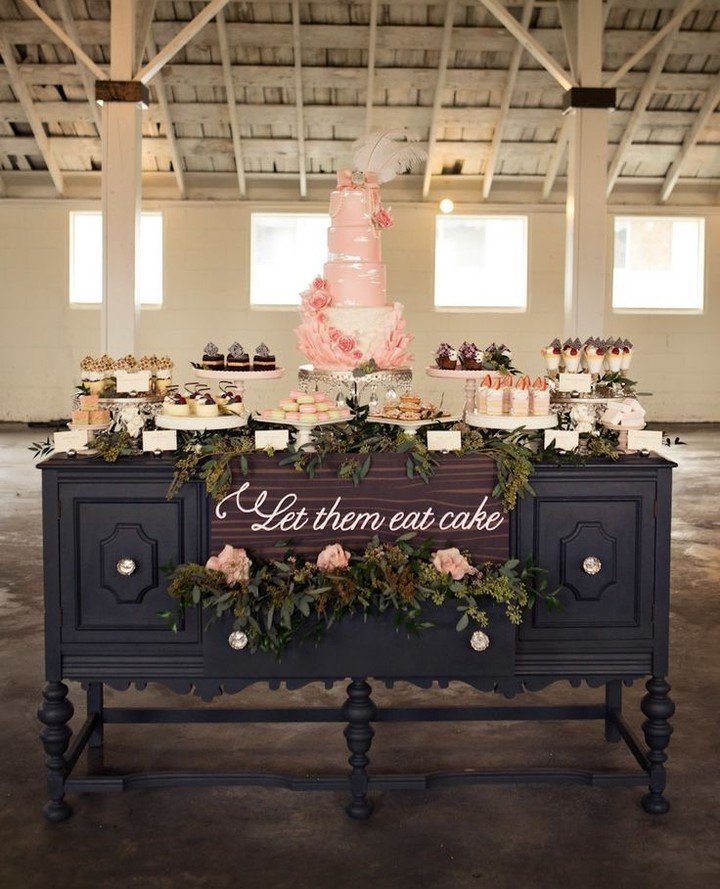 If there were ever a wedding that whispered “let them eat cake,” this would be it. A vintage dresser turned dessert station sets the tone, painted deep navy and dressed with cascading greenery and blush roses. On top, a towering pink confection with sugar florals feels straight out of a French salon, delicate yet decadent.