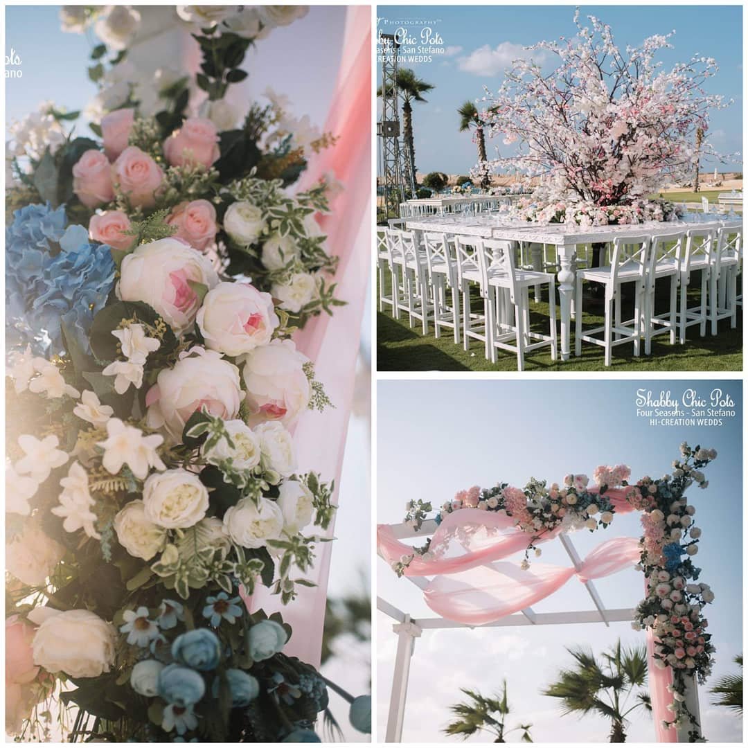 Blush draping flutters across a white arch, woven with roses, eucalyptus, and hints of powder blue. Nearby, a long white table sits beneath a flowering tree centerpiece that feels almost storybook.