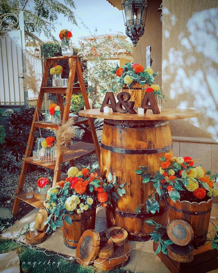 A wooden barrel topped with initials stands beside a ladder shelf dressed in bright florals and glass jars. Orange and yellow blooms pop against warm wood tones, creating a welcoming vignette at the entrance.