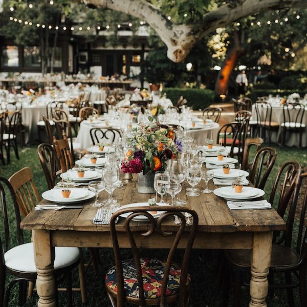 Wooden farm tables sit beneath string lights, surrounded by bentwood chairs and lush greenery. The centerpieces burst with seasonal color, deep reds, oranges, and soft purples gathered in loose arrangements.