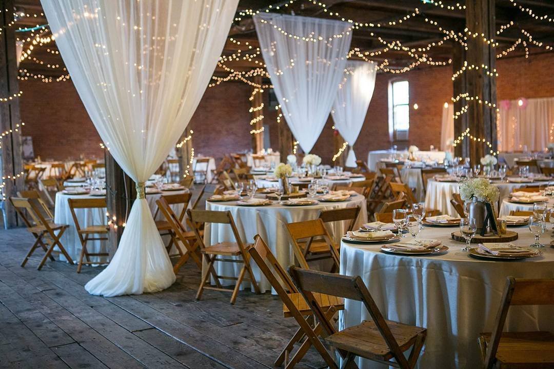 There is something about exposed brick, wooden floors, and warm string lights that instantly softens a space. This reception feels like a candlelit dinner tucked inside a countryside loft, where gauzy white draping floats from beams and round tables invite guests to linger a little longer. It is intimate without feeling small, elegant without trying too hard.