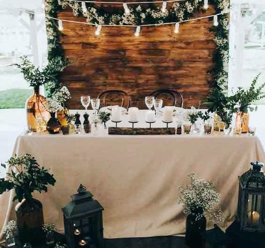 A wooden backdrop wrapped in greenery and string lights sets the mood for this sweetheart table. Amber glass bottles, black lanterns, and clusters of white candles create a soft glow against the natural wood.