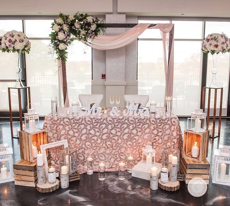 Wooden crates, lanterns, pillar candles, and a patterned blush linen come together in the most charming way. The sweetheart table feels curated but not fussy, with soft draping overhead and tall floral arrangements flanking each side.