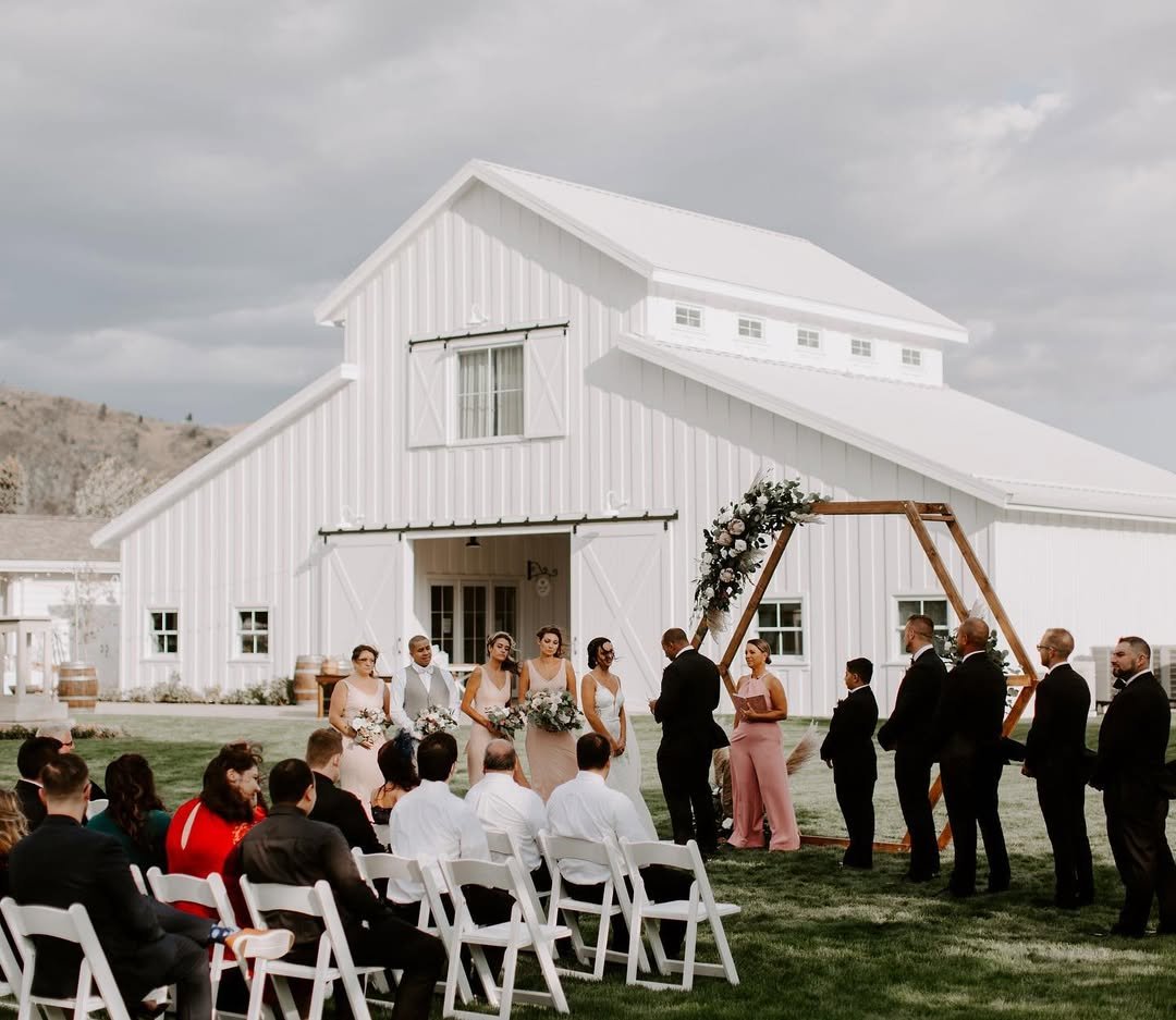 Set against a pristine white barn, this ceremony leans into simplicity. A wooden hexagon arch draped with greenery frames the couple, while guests sit on classic white folding chairs under an open sky.