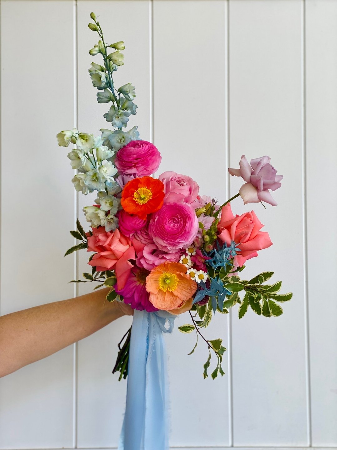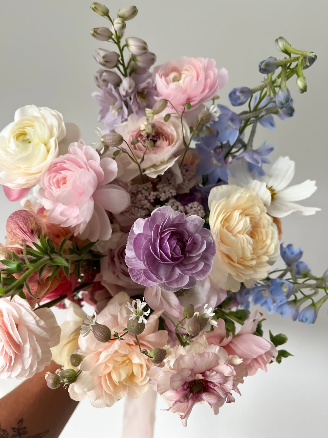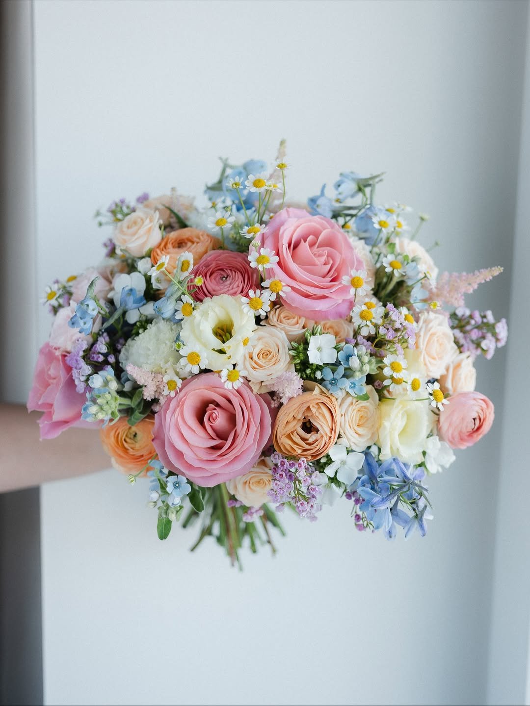 This bouquet is pure cheerful romance, like a spring day captured in florals. Vibrant coral ranunculus, cotton-candy pink roses, and powder blue delphiniums mingle with sprigs of daisy-like chamomile. It’s playful, a little wild, and completely captivating — the kind of arrangement that feels like it belongs at a garden brunch or beside a sun-drenched vanity.