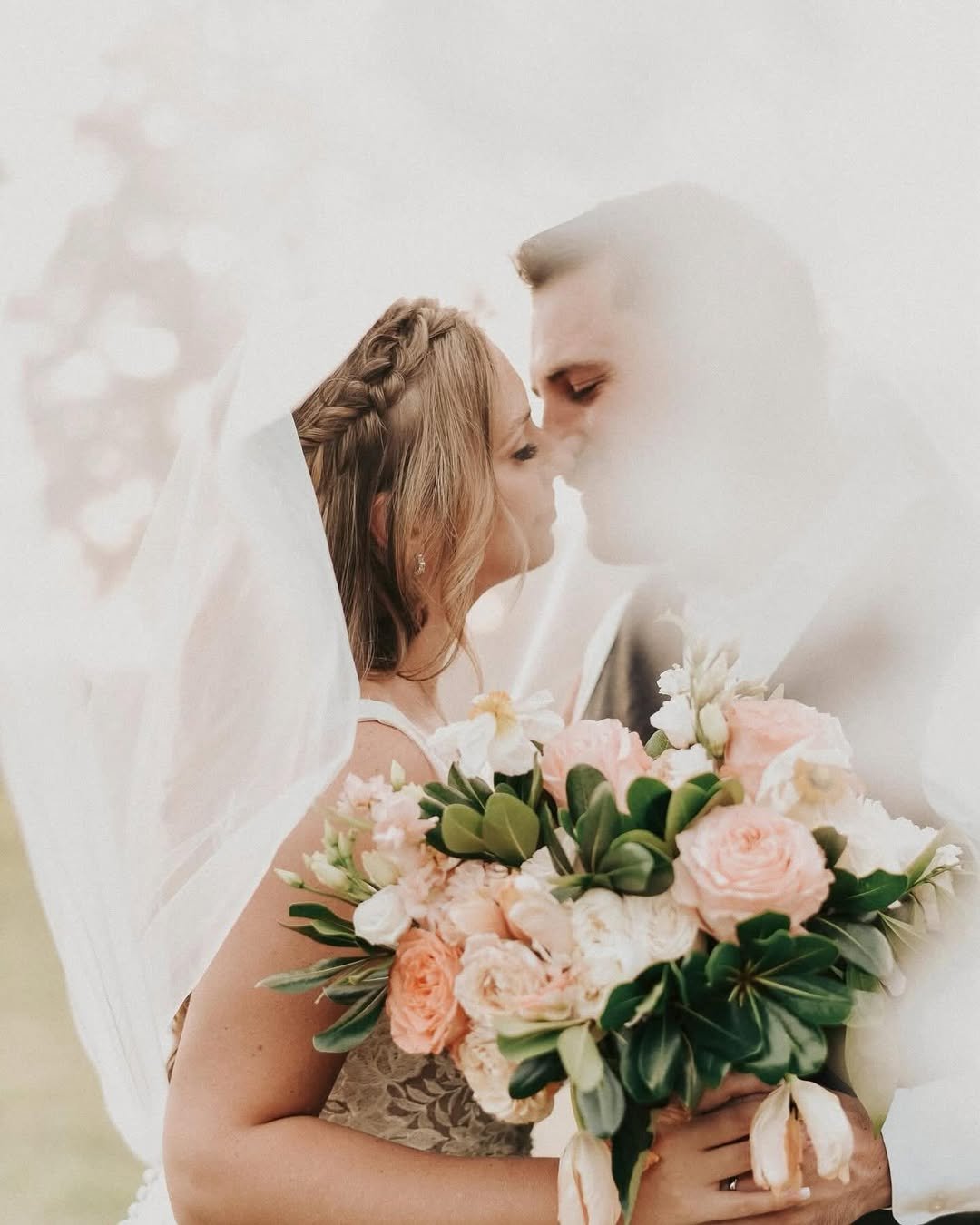 Soft light, delicate florals, and a kiss under the veil—this bouquet feels like a page torn from a love story. The creamy peach and soft blush roses are nestled into a bed of ruffled greenery, echoing the romantic tones of the moment. There’s a natural quietness to this palette, making it perfect for brides who want timeless elegance without overpowering their look.