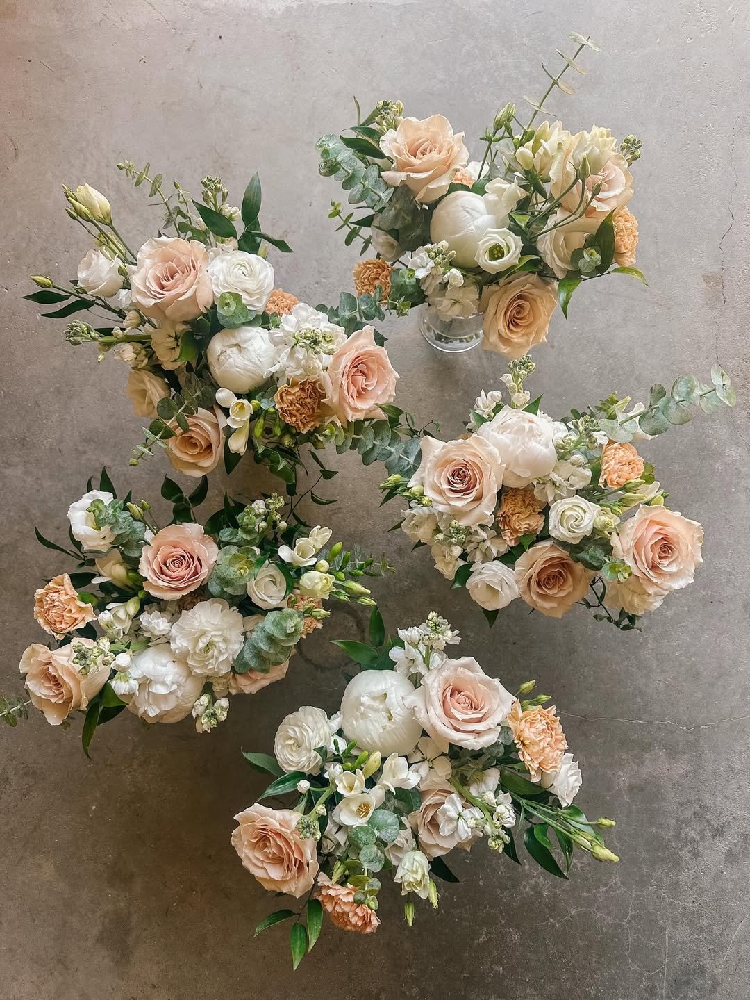 Warm neutrals and peachy creams make this group of bouquets feel both earthy and refined. Blousy roses, pale carnations, and pillowy white blooms give the arrangement a soft vintage feel, while eucalyptus and sprigs of green add movement and depth.