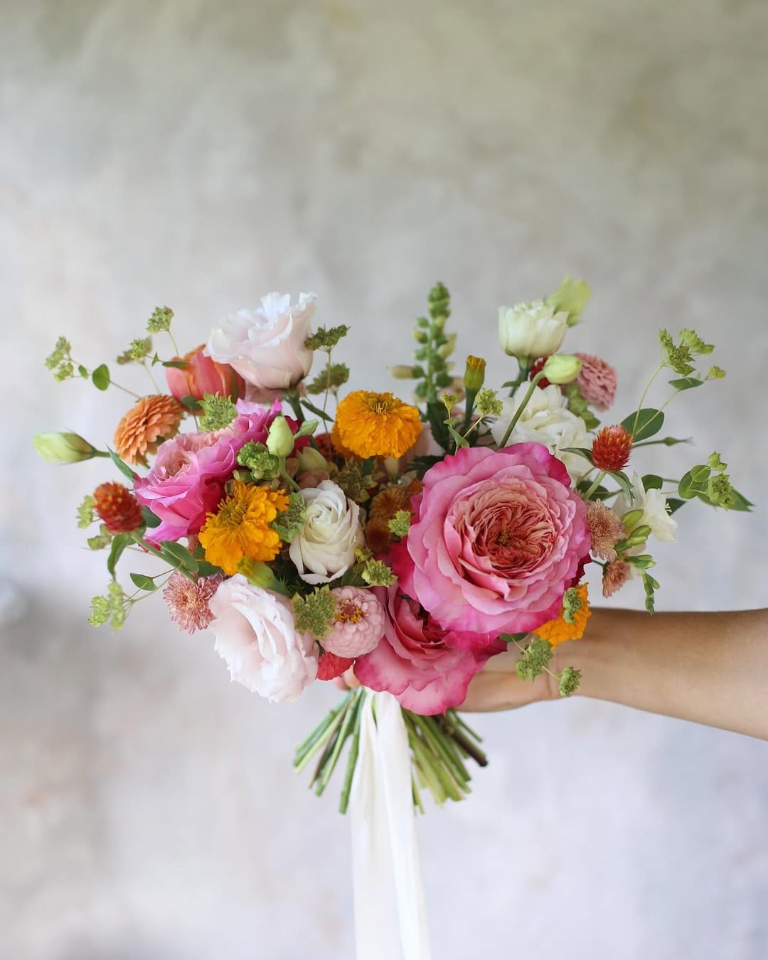 This bouquet is all about texture: crinkly marigolds, bouncy zinnias, ruffled garden roses. The palette leans bold—clementine orange, soft blush, deep pink—and feels like it was gathered straight from a sun-drenched cutting garden.