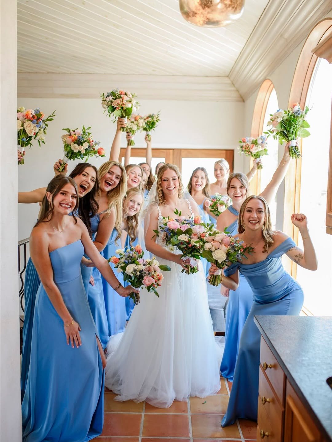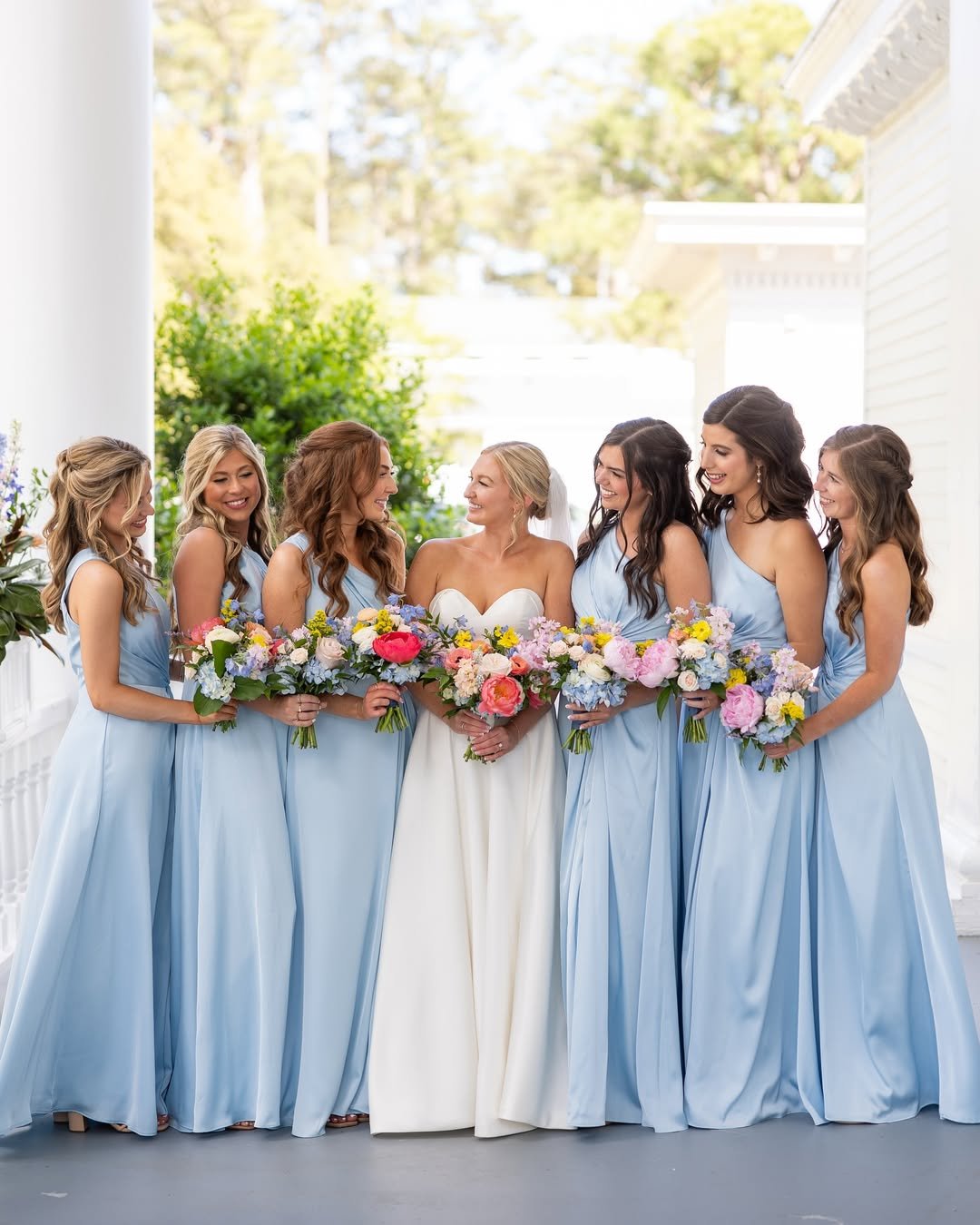 Everything about this wedding party feels joyfully classic, but with a twist of southern charm. Sky blue dresses and bold garden blooms make for a timeless pairing. And those bouquets? A perfect mix of structured roses and carefree petals in juicy coral, buttercup yellow, and baby blue.