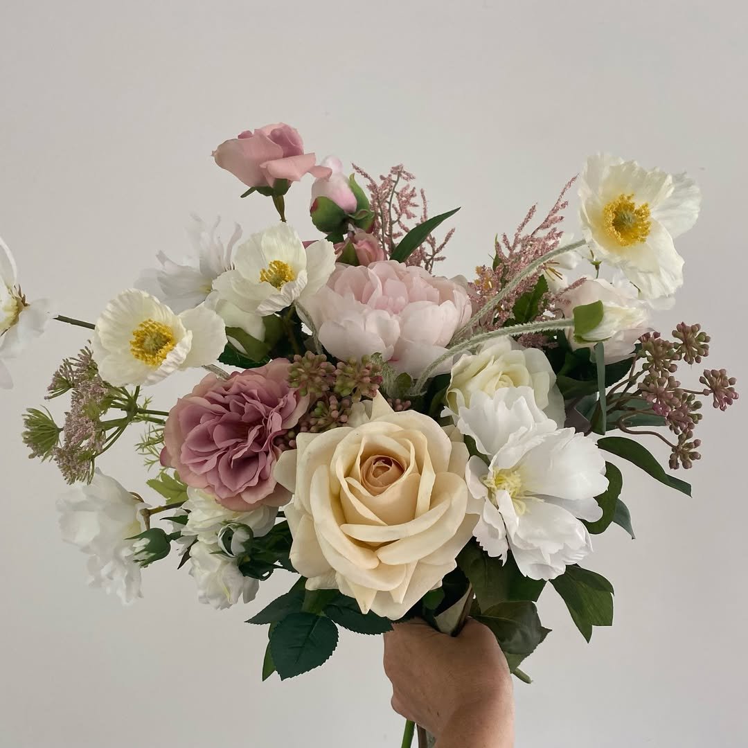 Feathery blooms in blush, mauve, and ivory come together in a bouquet that’s airy but grounded. There’s a moodiness to it, despite the soft colors—like walking through a flower field at dusk. It’s beautifully undone, the kind of bouquet that doesn’t try too hard and ends up being the favorite.