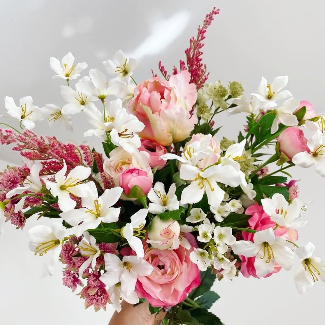 There’s something sweetly nostalgic about this bouquet. Creamy ranunculus, dainty waxflowers, and cotton-candy pink blooms come together in a way that feels like childhood memories in bloom. The scale is modest, but the charm? Immeasurable.