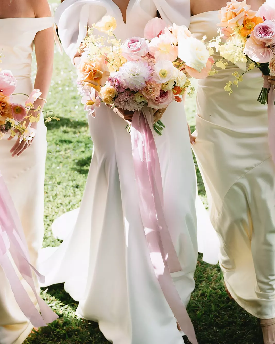 This is pure sunshine and pink champagne. Creamsicle roses, blushing ranunculus, and pale yellow orchids tumble together with gossamer pink ribbon streaming to the grass — a dreamy, feminine palette for a wedding drenched in light.