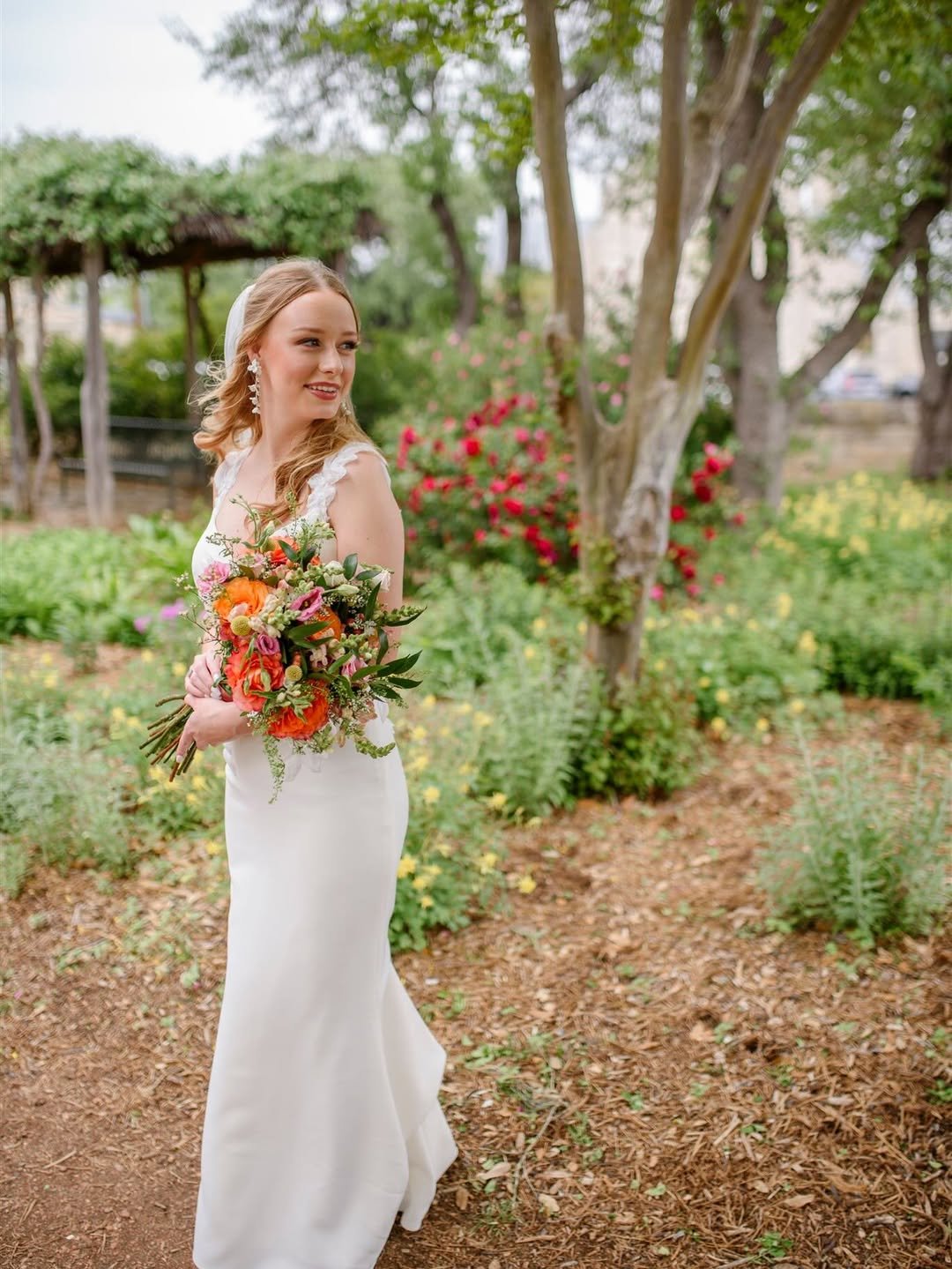 There’s something magical about this moment — a bride in motion, caught between laughter and breeze. Her bouquet mirrors the scene: vibrant oranges, soft pinks, and lush greens wrapped into one artful armful. It’s warm, golden-hour energy in flower form.