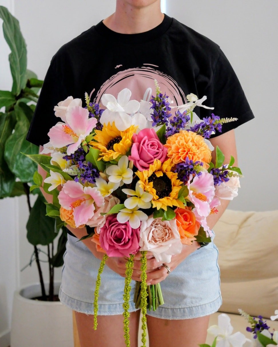 This bouquet feels like a summer picnic at golden hour. Sunflowers steal the show, framed by playful frangipani, sherbet carnations, and bubblegum-pink roses. The textures are wild but intentional, perfect for a laid-back, boho bride who still wants to look put together.